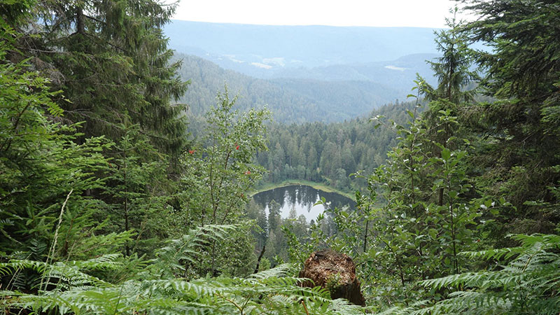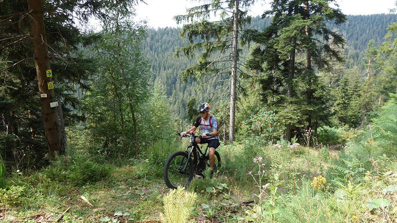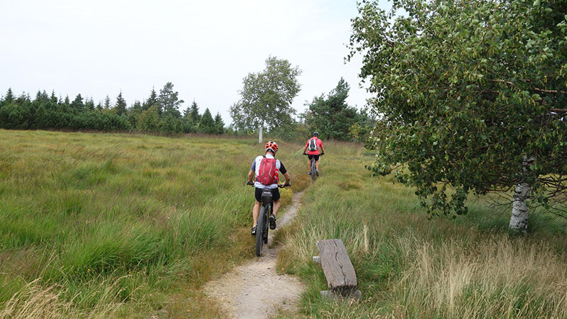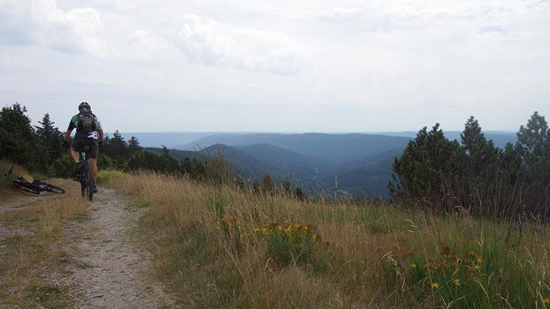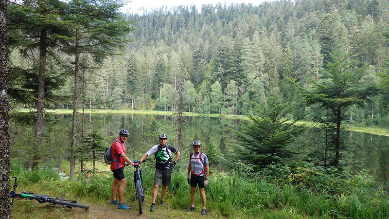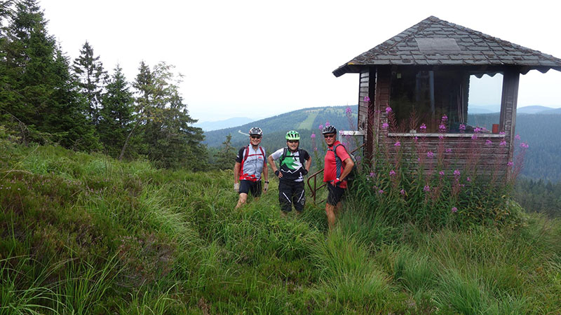 Vier unsere e-Mountainbike-Senioren zog es bei den tropischen Temperaturen am 28.7.2018 weit hinauf in die kühleren Regionen des Nordschwarzwaldes. Vom Murgtal ging es hinauf zum Schurmsee und Mummelsee. Über die Hornisgrinde hinüber zum Ochsenstall und nach Unterstmatt. Bei der schönen Trail-Abfahrt vom Hochkopf eröffneten sich immer wieder schöne Panorama-Aussichten über Bühlertal und die Rheinebene. Vom Mehliskopf führt ein schöner Trail hinunter nach Herrenwiese wo eine kurze Kaffee-Pause eingelegt wurde. Den sehr steinigen, ruppigen Pfad von der Badenerhöhe hinunter zum Herrenwiesersee was öfters Schieben angesagt. Wesentlich angenehmer schlängelte sich danach der bequeme Weg der Schwarzenbachtalsperre entlang. Deren Wasserstand lies in diesem regenarmen Sommer sehr zu wünschen übrig. Dem Schwarzwasserbach entlang war bald wieder das Murgtal erreicht. Nach 60 km mit 1.500 Höhnmeter Auffahrten war man bald wieder am Ausgangspunkt.