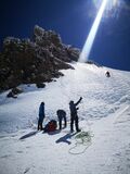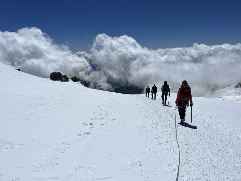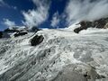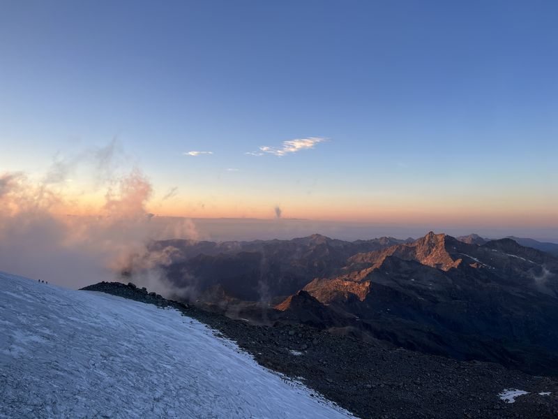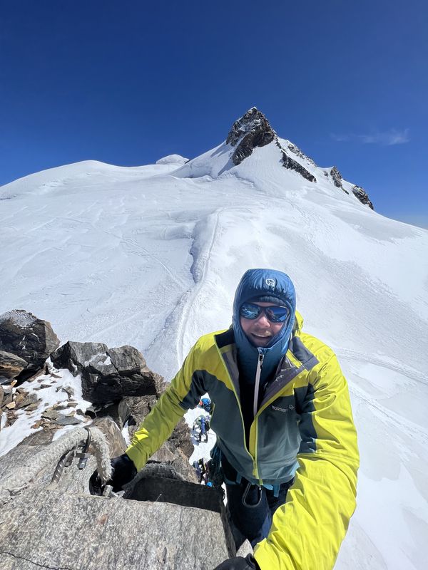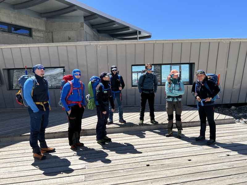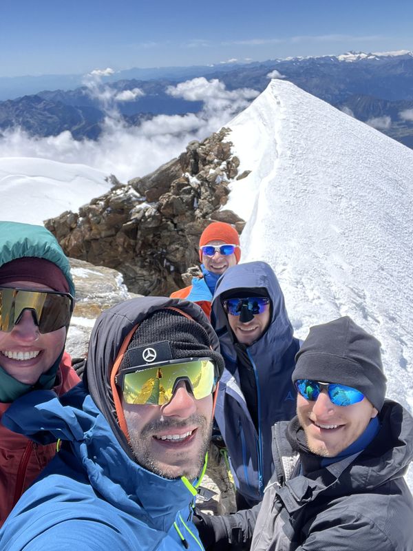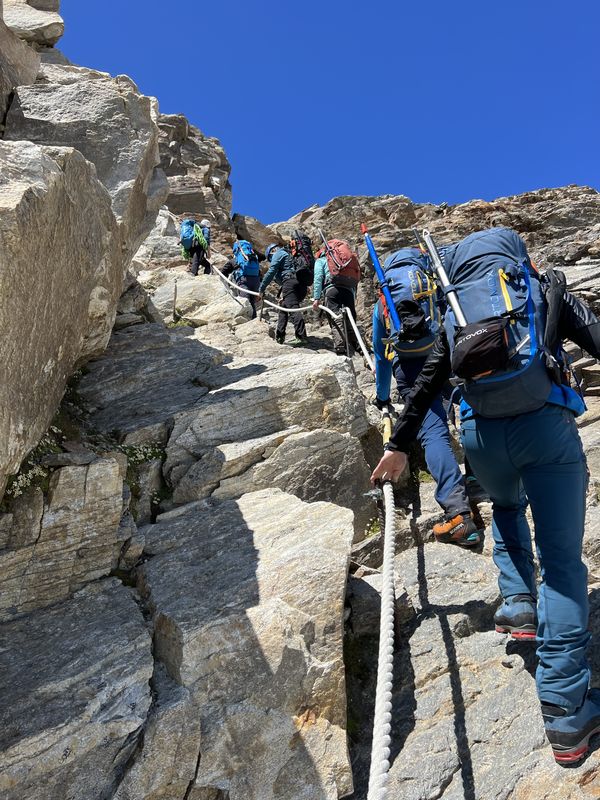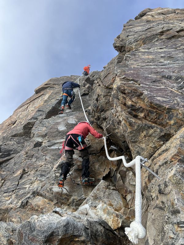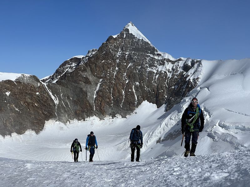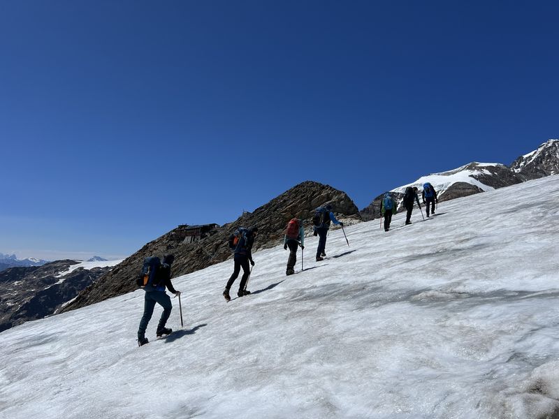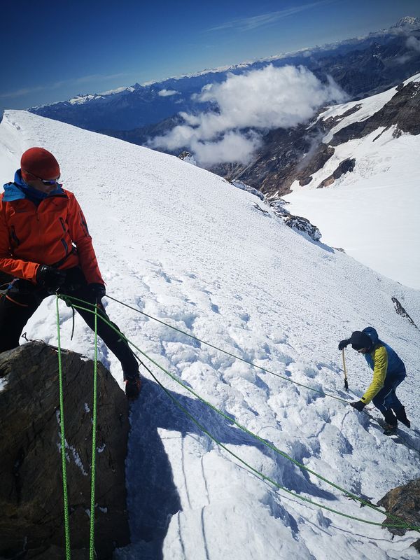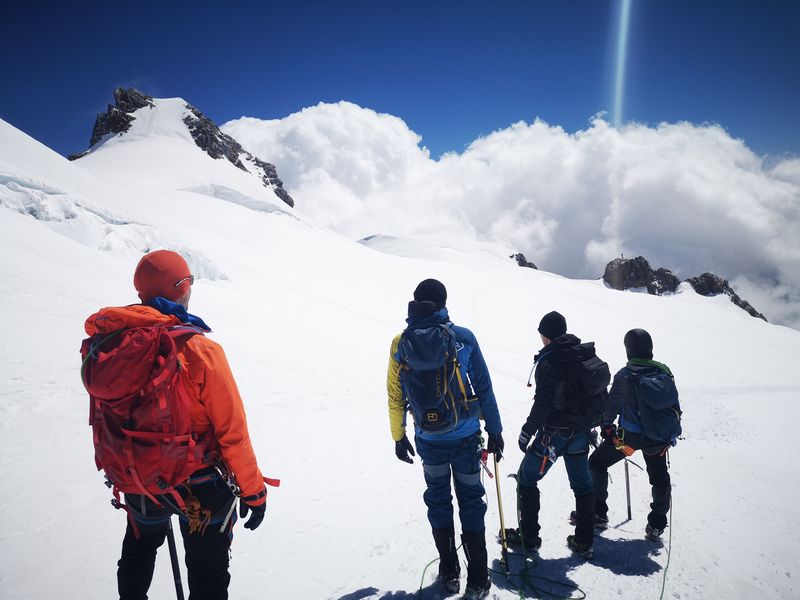 Am zweiten Tourentag stand eigentlich die Besteigung der Signalkuppe 4.554m auf dem Programm – leider gab es in der Nacht jedoch einen nicht vorhergesagten massiven Wetterumschwung mit Sturm und Gewitter, sodass sich die Gruppe nicht wie geplant um 5 Uhr auf den Weg zur höchstgelegenen Hütte auf der Signalkuppe machen konnte. Nach Abwarten mit Wetterbeobachtung und Lageeinschätzung machten sich die motivierten Bergsportler dann um 8:45 Uhr auf den Weg zu den Alternativ-Gipfeln Balmenhorn und Schwarzhorn. Das Schwarzhorn hat neben seiner Höhe von 4.322m einen weiteren besonderen Reiz: eine 50m lange und steile Eisflanke, die am durch einen der Trainer gelegten Fixseil durchstiegen wurde. Der Gipfel belohnte die Kletterer mit einer herrlichen Aussicht, da sich das Wetter mittlerweile deutlich gebessert hatte. Trotz der Wetter-Widrigkeiten zu Beginn des Tages und damit verbundenen Umplanungen war die Gruppe am Ende des Tages sehr glücklich mit den Erlebnissen und eindrucksvollen Gipfeln.