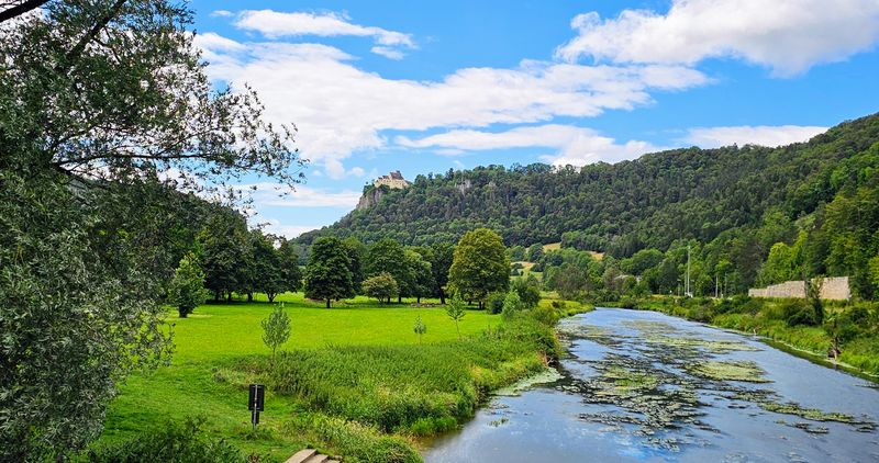 Unter der Schloss-Ruine Hausen schlängelte sich der Weg hinunter ins Donautal. Von der Brücke aus thronte das Schloss Werenwag stolz über der blauen Donau. Statt dunklen Wolken präsentierte sich das Donautal -im wahrsten Sinne des Wortes- mit „Bilderbuch-Wetter“.