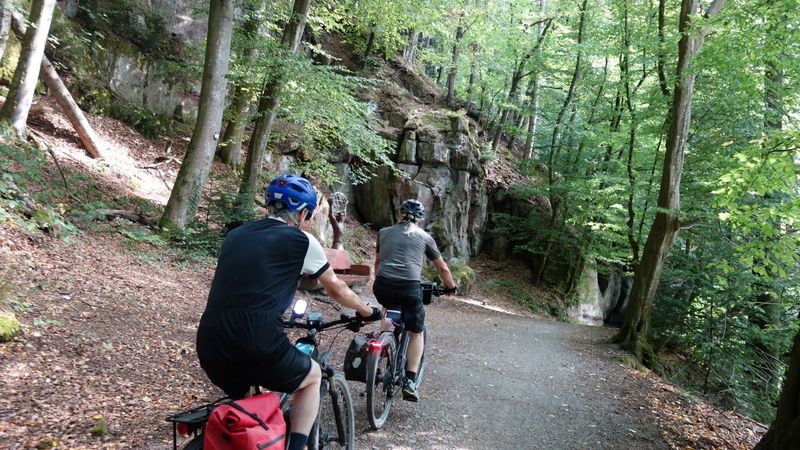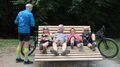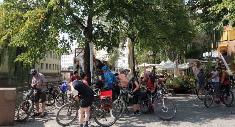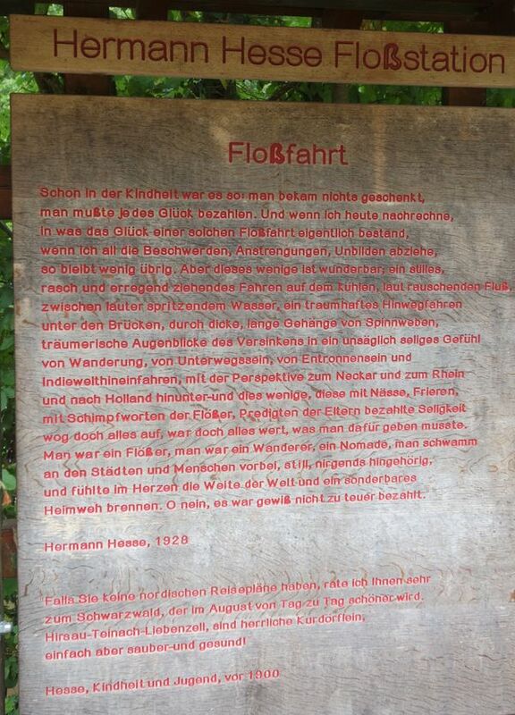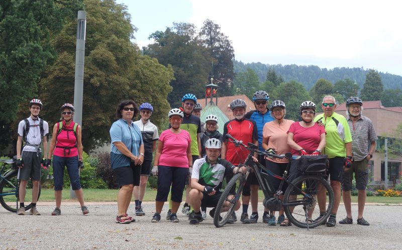 15 Teilnehmer trafen sich bei heiterem Wetter in Bad-Liebenzell. Mit dem Guide, Roland Kling startete die Tour durch den Kurpark und Sophiepark. Hier erinnert eine Infotafel an die Floßfahrt-Beschreibung des Nobelpreisträgers Hermann Hesse. Seine Ausführungen treffen auch ein wenig auf Radtouren-Radler zu.