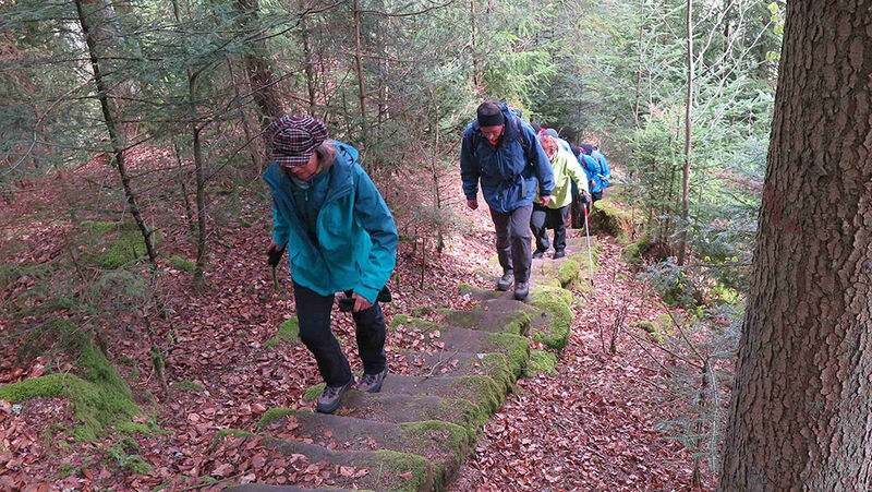 Auf der Höhe war vom Waldhufendorf Emberg noch viel der Ursprünglichkeit zu sehen, alte, eingefasste Gärten, die verschiedenen Hufe der Bauernhöfe, das Backhaus, das gemeinschaftlich genutzt wurde. Danach ging es durch die Wolfsschlucht Richtung Röthenbach.