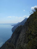 Ein kleines Stück mussten wir wieder zurück in die Schlucht wandern, danach ging es Richtung Campogrande steil den Berg aufwärts. Über einen Steilabbruch erklommen wir den Monte Castello mit 779 Metern. Immer wieder waren alte Geschuss-Stellungen aus dem ersten Weltkrieg zu sehen, die damals an tollen, fantastischen Aussichtspunkten in 700 Meter über dem See angelegt wurden. Der Blick reichte nach Norden zum oberen See-Ende bis zur Südseite nach Sirmione. Unterhalb von uns lag wie auf einem Adlerhorst das Kloster Madonna di Montecastello auf 681m. Das heutige Gotteshaus stammt aus dem 16. Jahrhundert. Die erste Besiedlung war ein heidnischer Tempel. Über dem Ort liegt eine ganz tolle melancholische Stimmung.