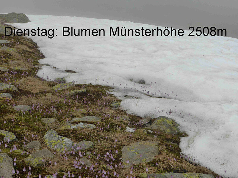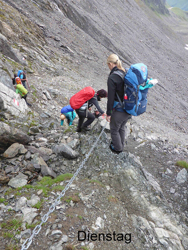 Abmarsch gegen acht zum Westfalenhaus bei Regen. Mit 3 ½ Stunden war fast ein Ruhetag angesagt, der Regen ließ nach. So blieb nach Zeit, kurz vor der Hütte noch einen kleinen Gipfel mitzunehmen, die Münsterhöhe mit 2508m. Berge in Wolken, aber manchmal tauchten die umliegenden 3000er zwischen den Wolkenfetzen auf.