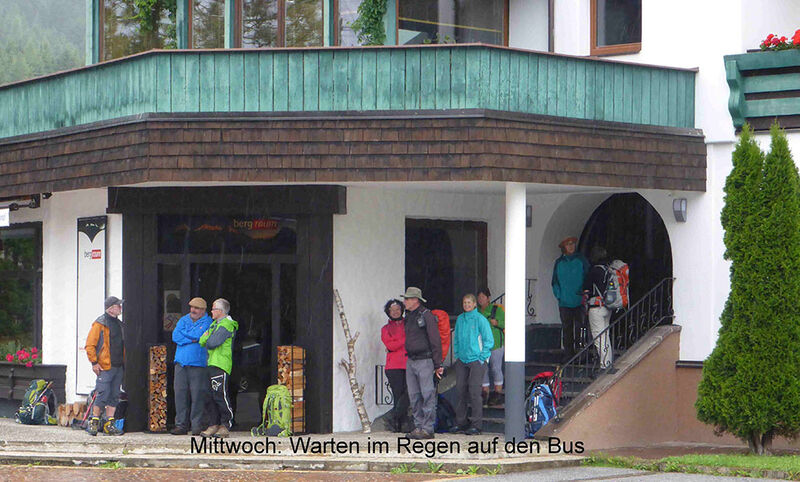 Oben Wolken, unten Wolken, keine Wetterbesserung in Sicht: Also Abstieg ins Tal, zunächst nach Lüsens, dann weiter nach Paxmar. Der Regen hatte uns unterwegs eingeholt, und wir warteten bei einer Suppe auf dem Bus in dem Gasthaus, das für die Übernachtung am kommenden Tag für uns gebucht war. Mit dem Bus erreichten wir dann nach einem Umstieg wieder die Autos an der Dortmunder Hütte in Kühtai.