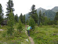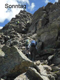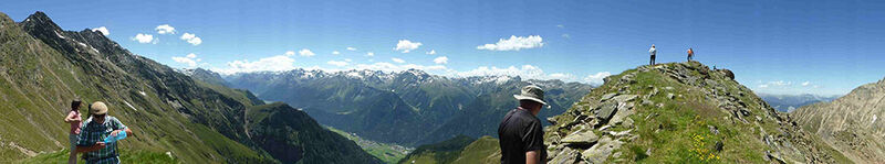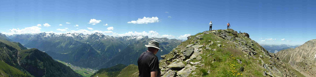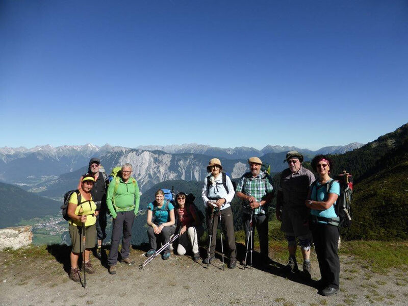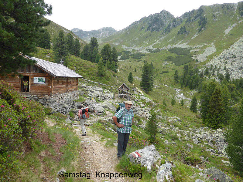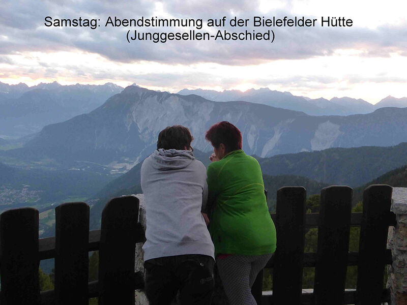 Samstags trafen wir uns an der Dortmunder Hütte, ein Auto wurde zum geplanten Abstiegsort vorgestellt, und los ging`s in 4 Stunden zur Bielefelder Hütte. Auf dem Knappenweg kamen wir am Knappenhaus vorbei, innen ein kleines Bergbaumuseum und nebenan ein altes Pochwerk. Immer wieder weite Ausblicke ins Inntal und auf die dahinter liegenden Stubaier, auch abends von der Terasse der Bielefelder Hütte aus bei romantischem Sonnenuntergang. Eine trinkfeste Gruppe aus dem Tal feierte dort Junggesellen-Abschied, hochprozentige Getränke gab es dort flaschenweise.