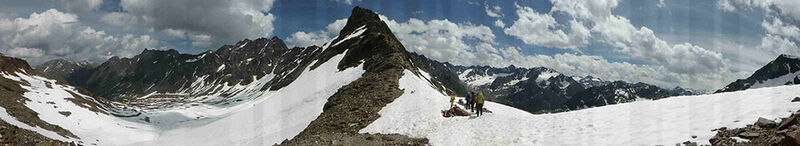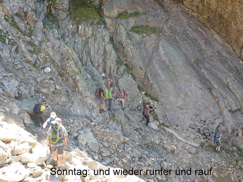 Die Königs-Etappe von der Bielefelder zur Schweinfurther Hütte. Acht Stunden waren auf dem Wegweiser angegeben, und um 8 Uhr starteten wir bei herrlichem Sonnenschein. Durch Latschenfelder führte der Weg zunächst zur verfallenen ehemaligen Bielefelder Hütte, dann höher in felsiges Gelände. Ausgesetzte Passagen mit Klettereinlagen, immer wieder noch ein Kar und noch eine Scharte, dann noch zu querende Schneefelder, – der Weiterweg verlangte uns alles ab. In den Pausen und an den Wartestellen konnten wir den Blick über die beeindruckende Hochgebirgslandschaft schweifen lassen. Nach mehr als neun Stunden kamen wir an der Gruben-Schweinfurther Hütte an. Der Hüttenwirt zeigte sich überrascht: den Weg war in dieser Saison noch niemand gegangen. Das abendliche heftige Gewitter konnte uns auf der glasbedachten Terrasse glücklicherweise nichts mehr anhaben.
