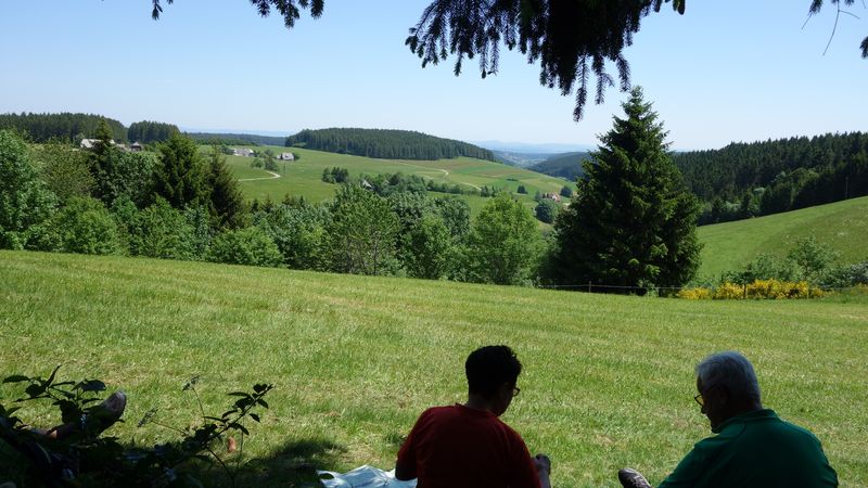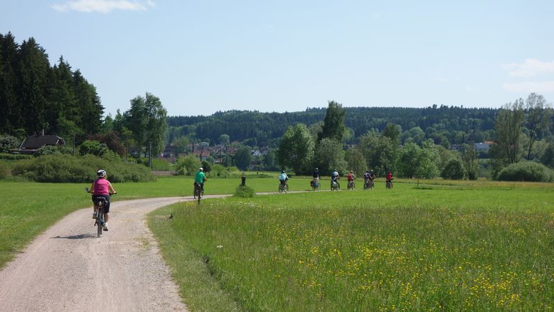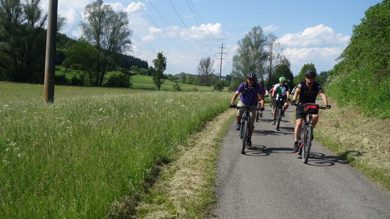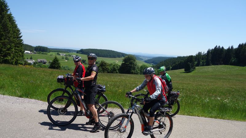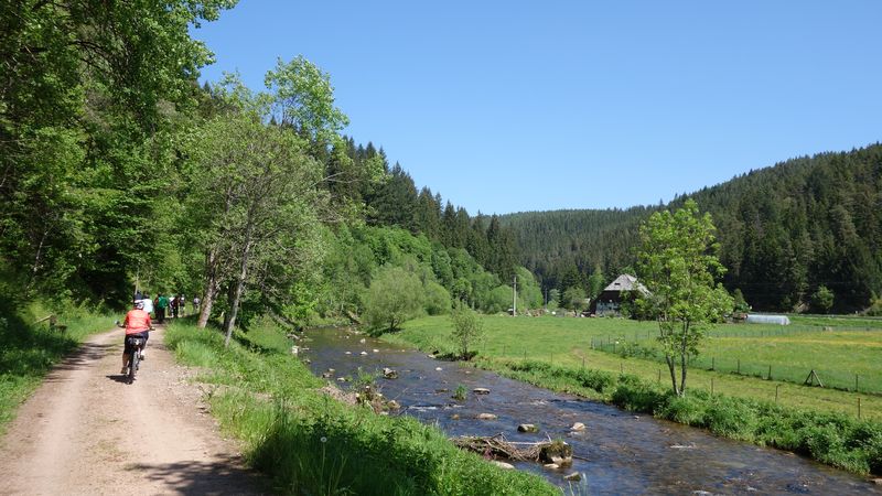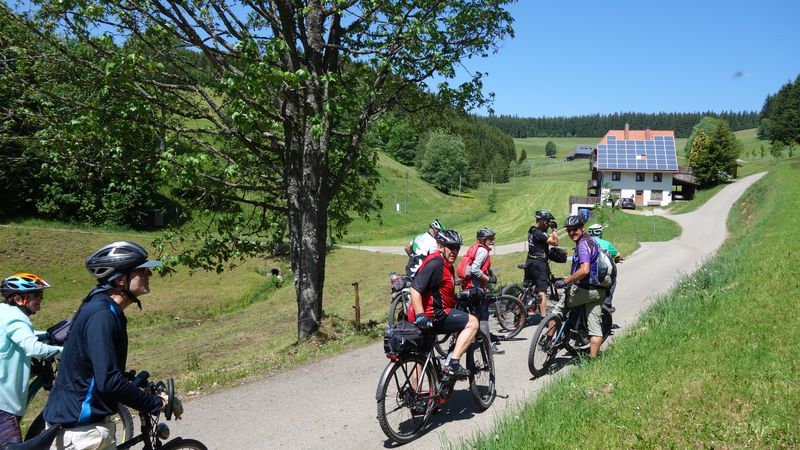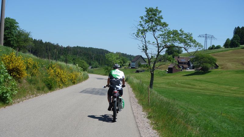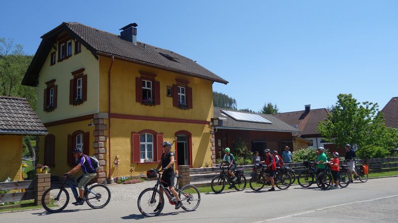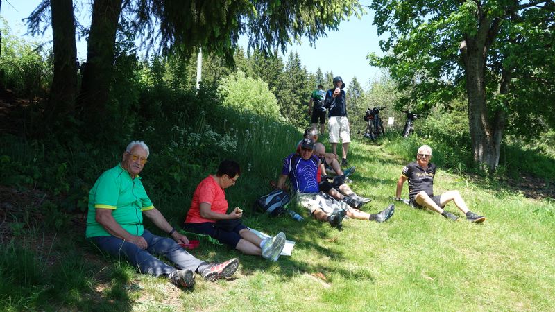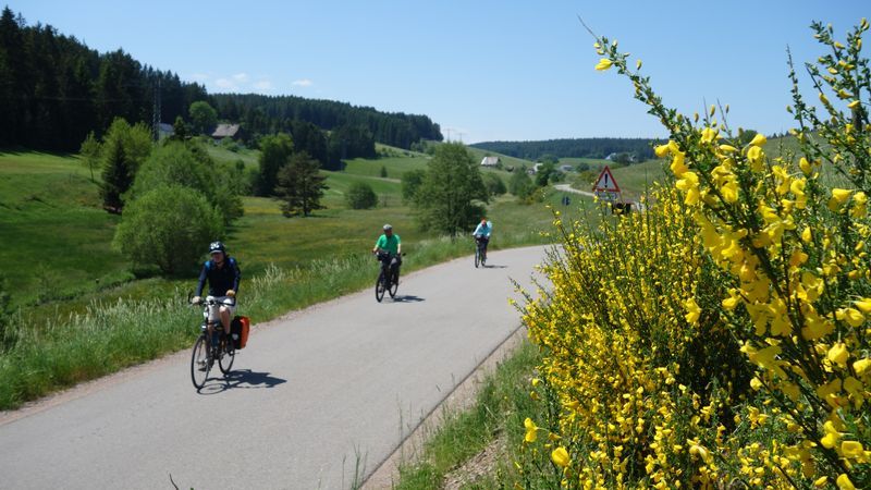 10 Teilnehmer starteten in Hüfingen. Zuerst ging es durch die schöne Altstadt von Bräunlingen hinein in das weite Bregtal. In Wolterdingen musste der neu erbaute Hochwasserdamm überwunden werden. In Hammereisenbach erinnerte noch ein alter historischer Bahnhof an die Zeit, wo hier noch eine Eisenbahn von Donaueschingen bis nach Furtwangen geführt hat. Nach Vöhrenbach wurde es das Langenbachtal hinauf etwas steiler. Die Sicht auf die vielen Höfe in den romantischen Tälern zeigten den „Schwarzwald wie im Bilderbuch“. Ab dem Breghäusle ging es in Höhenlagen über 1.000 m aussichtsreich weiter hinüber zum Kesselberg. Hier hatte man vom Vesperplatz aus eine herrliche Aussicht in das Kirnachtal und hinüber bis zur Schwäbischen Alb. Durch Stockwald gab es eine rasante Abfahrt hinunter ins Brigachtal. Dass die Strasse das Brigachtal hinaus Autofrei war sollte sich für uns Radfahrer bald rächen, denn ein unüberwindbarer Graben einer Baustelle zwang zur Umkehr. Die selbst gefundene Waldweg-Umleitung war zwar kurz aber erforderte eine 50 Höhenmeter steile Auffahrt. Dafür gab es in der schönen historischen Altstadt von Villingen eine Kaffepause in einem Straßencafe. Weiter ging es das ebene Brigachtal hinaus nach und durch Donaueschingen. Vorbei an der Donauquelle und dem Schloss Fürstenberg führte die Tour weiter durch den schönen Schlosspark und wieder zurück nach Hüfingen. Nach 74 km mit 600 Höhenmeter Auffahrten war der Start- und Zielparkplatz wieder erreicht.