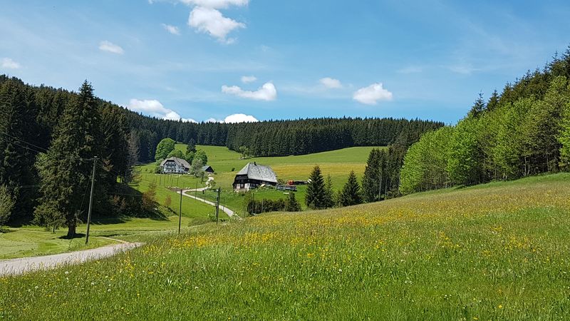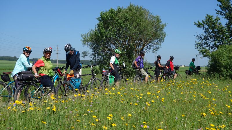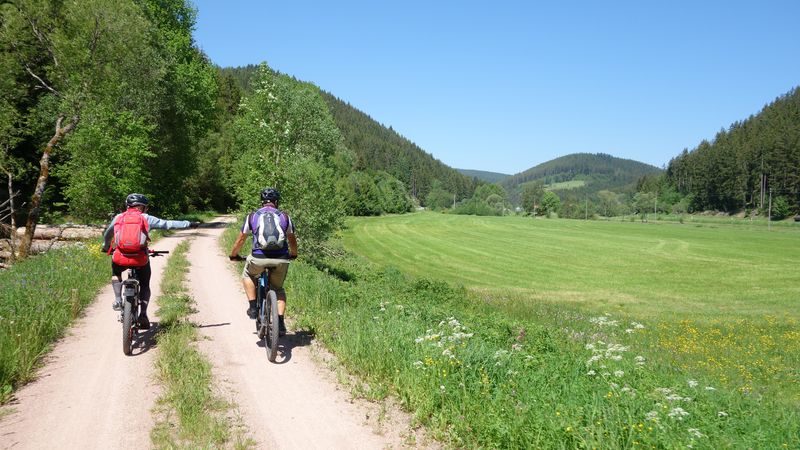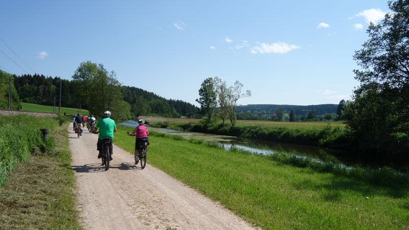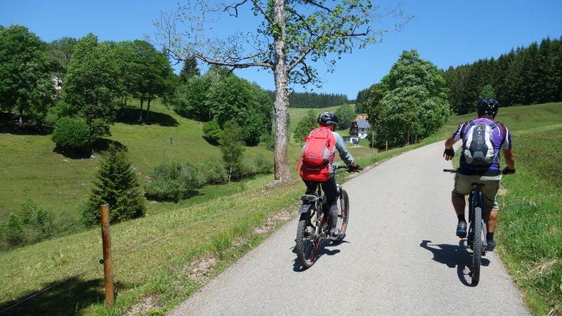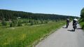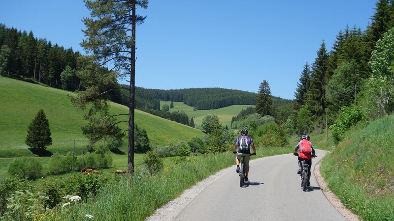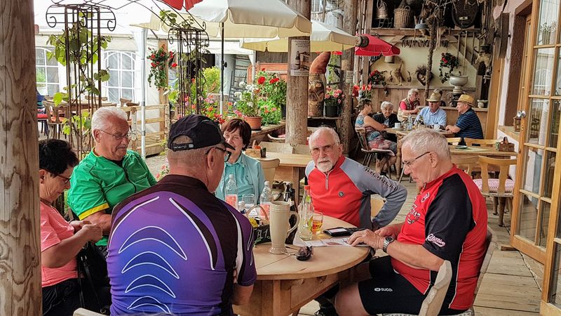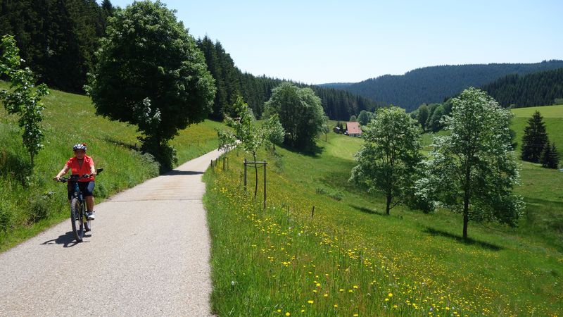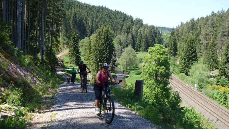 10 Teilnehmer starteten in Hüfingen. Zuerst ging es durch die schöne Altstadt von Bräunlingen hinein in das weite Bregtal. In Wolterdingen musste der neu erbaute Hochwasserdamm überwunden werden. In Hammereisenbach erinnerte noch ein alter historischer Bahnhof an die Zeit, wo hier noch eine Eisenbahn von Donaueschingen bis nach Furtwangen geführt hat. Nach Vöhrenbach wurde es das Langenbachtal hinauf etwas steiler. Die Sicht auf die vielen Höfe in den romantischen Tälern zeigten den „Schwarzwald wie im Bilderbuch“. Ab dem Breghäusle ging es in Höhenlagen über 1.000 m aussichtsreich weiter hinüber zum Kesselberg. Hier hatte man vom Vesperplatz aus eine herrliche Aussicht in das Kirnachtal und hinüber bis zur Schwäbischen Alb. Durch Stockwald gab es eine rasante Abfahrt hinunter ins Brigachtal. Dass die Strasse das Brigachtal hinaus Autofrei war sollte sich für uns Radfahrer bald rächen, denn ein unüberwindbarer Graben einer Baustelle zwang zur Umkehr. Die selbst gefundene Waldweg-Umleitung war zwar kurz aber erforderte eine 50 Höhenmeter steile Auffahrt. Dafür gab es in der schönen historischen Altstadt von Villingen eine Kaffepause in einem Straßencafe. Weiter ging es das ebene Brigachtal hinaus nach und durch Donaueschingen. Vorbei an der Donauquelle und dem Schloss Fürstenberg führte die Tour weiter durch den schönen Schlosspark und wieder zurück nach Hüfingen. Nach 74 km mit 600 Höhenmeter Auffahrten war der Start- und Zielparkplatz wieder erreicht.