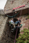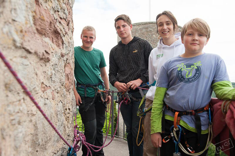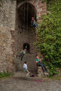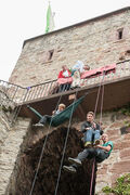 Als sportliche Herausforderung war eine Abseilpiste vom Turm eingerichtet. Dieser konnte auch per Strickleiter erklommen werden, anstatt wie gewohnt du Fuß über die steile Steintreppe. Neben diverser Abseilvorführungen der Kletterjugend war auch eine Slackline eingerichtet, an der sich Jedermann probieren konnte.