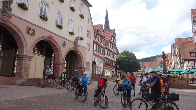 19 Teilnehmer des Alpenvereins Calw und Nagold starteten wieder zusammen zu einer Radtour. Der Tourenleiter Roland Kling führte die Gruppe 50 km „Rund um Calw“ mit den schönsten Ansichten und Aussichten allen Stadtteile und Ortschaften: Kurpark und Klosteranlage in Hirsau, Welzberghütte mit Aussicht auf Hirsau, Grüner Weg in Heumaden mit Aussichten auf Calw, Galgenberg in Stammheim mit Panorama-Aussicht über Calw und Stadtteile, Augenblick-Panorama von Holzbronn, Gimpelstein am Schießberg über Calw, Schafott beim Wimberg, Speßhardt mit Spritzenhaus und Schulhaus, Bauernhausmuseum in Altburg. Und am Ende der historische Marktplatz sowie die Nikolausbrücke.