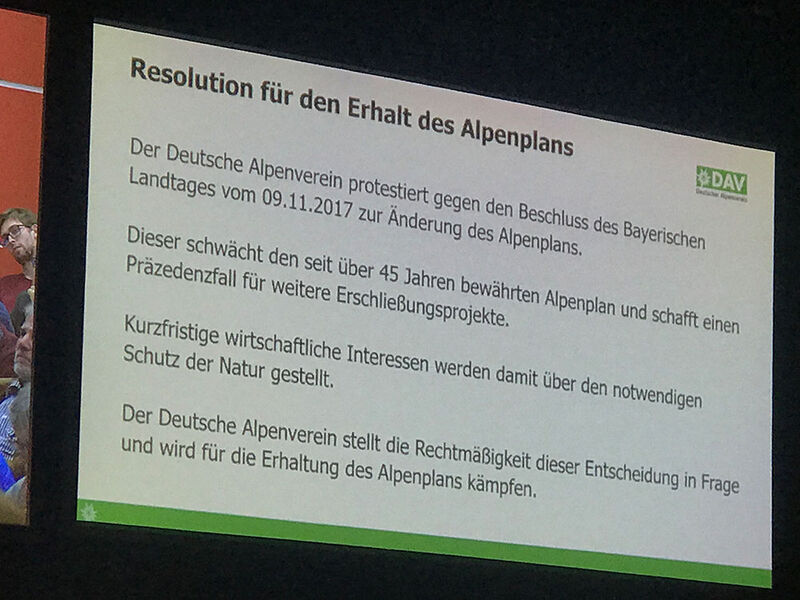 Neben den üblichen Berichten des Präsidiums standen interessante und wichtige Entscheidungen an. Von der Sektion "Der Alpinistenclub" wurde kurzfristig der Antrag eingebracht, die Hauptversammlung möge eine Resolution zur, durch die Landesregierung geplante, Schwächung des Alpenplans verabschieden und veröffentlichen. Der Antrag wurde nahezu einstimmig angenommen und es wurde folgende Resolution verabschiedet: