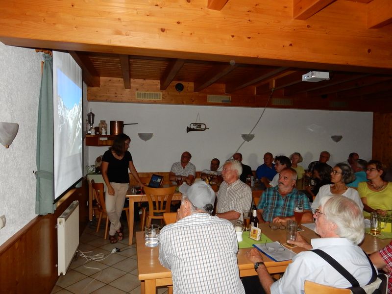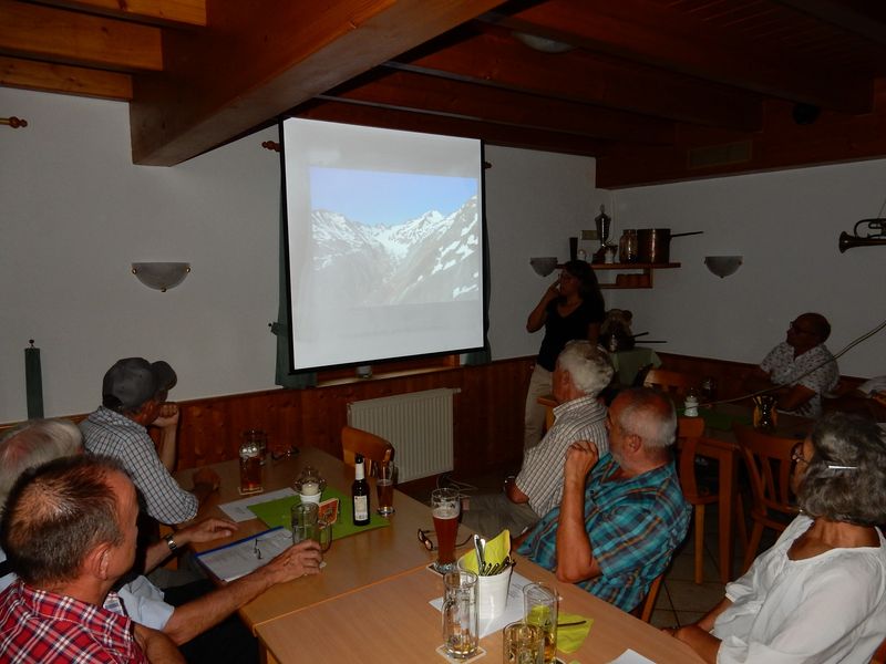 An die 50 Interessierten haben den Ausführungen über den Gletscherrückgang in der Alpenregion gelauscht. Birgit erklärte wie die periodischen Klimaveränderungen bereits in den vergangenen 500000 Jahren die Erde und somit die Gletscher immer wieder heimgesucht hatten. Mit dem Unterschied zu heute, dass, die durch den Menschen zusätzlich verursachten Treibhausgas-Emissionen, dieser Prozess enorm beschleunigt wird. Birgit beschrieb auch, wie aufwendige Messungen an den Gletschern durchgeführt werden und belegte dies mit eindrucksvollen Bildern und Abbildungen. Durch die Gletscherrückgänge müssen viele Wander-Routen umverlegt werden und auch durch das Schmelzen des Permafrostes sind Murengänge, Steinschläge und Felsstürze immer häufigere Gefahren für Bergsportler. In Gletschern bilden sich unterirdische Gletscherseen, sogenannte Gletschertaschen, welche unkontrolliert brechen können und so für große Überschwemmungen sorgen. Somit betrifft der Klimawandel alle, welche in den Bergen unterwegs sind, wie auch alle Menschen talabwärts. Aber auch als größter Süßwasserspeicher sind die Gletscher für alle Menschen überaus existentiell.