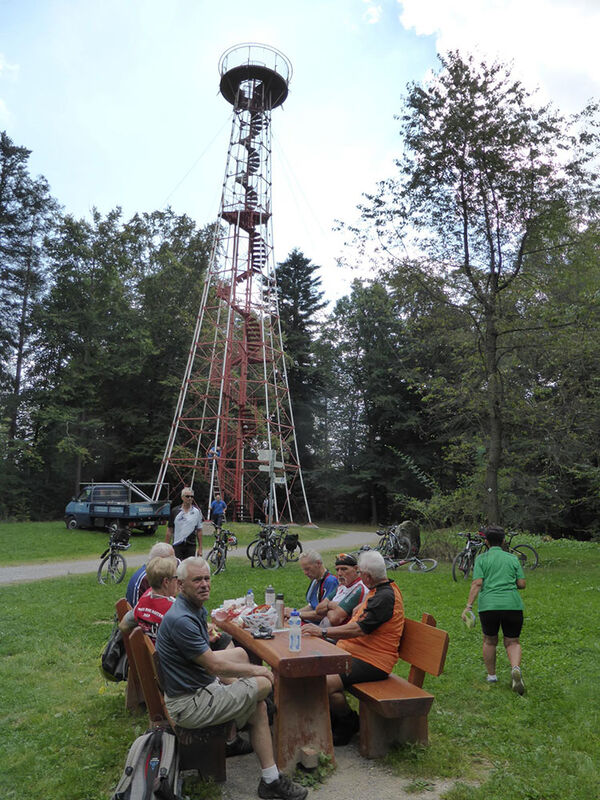 Weiter ging die Tour durch Büchenbronn bis zum historischen Wasserturm des Pfrorzheimer Rod-Viertels. Ab Dillweißenstein durch das Nagoldtal auf dem Heidelberg-Schwarzwald-Bodensee-Radweg entlang bis nach Calw. Zwei Teilnehmer nutzten den angebotenen Auto- Shuttle hinauf zum Start- Und Zielpunkt. Die übrige Gruppe strampelte noch die 200 Höhenmeter hinauf auf den Wimberg.