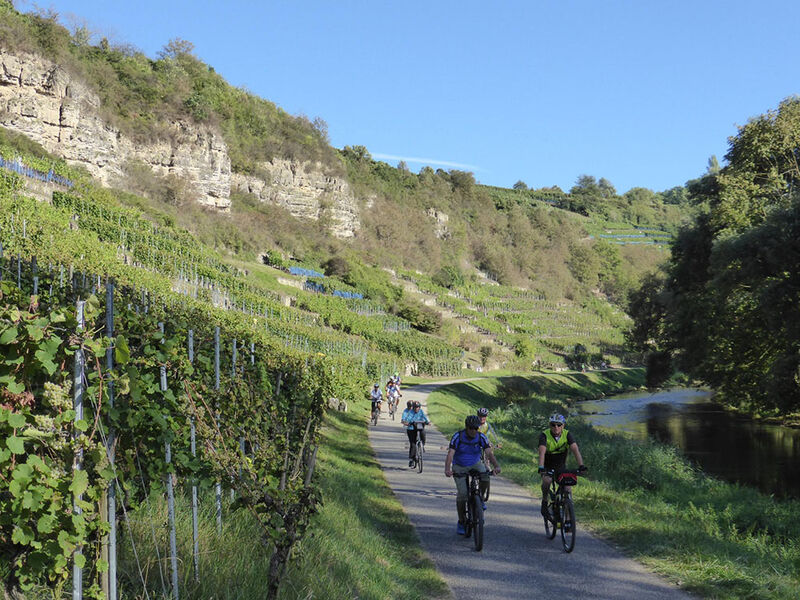 Nach Zaisersweiher verlief die Radroute direkt der ICE-Bahnlinie entlang. Unter den Weinbergen von Schützingen, Gündelbach, Horrheim und Ensingen ging es nach Vaihingen an der Enz. Vom Schloss Kaltenstein genoss man eine herrliche Panorama-Aussicht über das dortige Enztal.