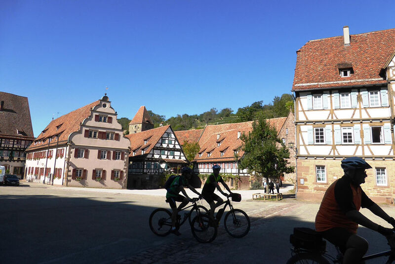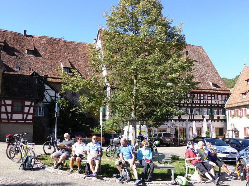 Die Tour verlief zwischen Enztal und Stromberg in das Anbaugebiet des Würrttemberger Weines. Über Ölbronn-Dürrn ging es erst in Richtung Norden. Zwischen Ötisheim und Kleinvillars querte man die ehemalige Waldenser-Route . Eine entsprechende Infotafel erklärte die Hintergründe der vor über 300 Jahren geflüchteten Waldenser nach Würrtemberg wo die Orte wie Neuhengstett, Perouse, Serres, Pinache , Klein-/Großvillars entstanden. In Maulbronn ging es durch die Hermann Hesse-Strasse in das dortige Kloster Maulbronn, heute ein sehenswertes UNESCO-Weltkulturerbe. Hermann Hesse flüchtete dort 1892 von der Seminar-Schule. Den Donnertsgags- Radlern gefiel es dort offensichtlich besser, sie legten hier im Innenhof eine ausgiebige Vesper-Pause ein.