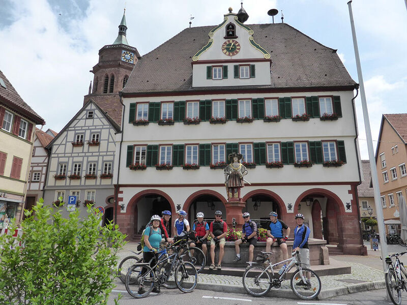 Auf meist befestigten Wegen ging es größtenteils außerhalb des Waldes in der Sonne durch das Heckengäu durch schöne Naturschutzgebiete. Vom Waldenserstein in Neuhengstett den Gäurandweg entlang über den Büchelberg hinüber ins Badische in den Enzkreis. Durch Neuhausen und Steineck hinunter nach Tiefenbronn. Von hier aus den Würmtalradweg über Mühlhausen, und Merklingen nach Weil der Stadt. Nach einer kleinen Altstadtrunde mit Geschichtsinfos über die ehemals freie Reichstadt wurde im Starssencafe eine Pause eingelegt.