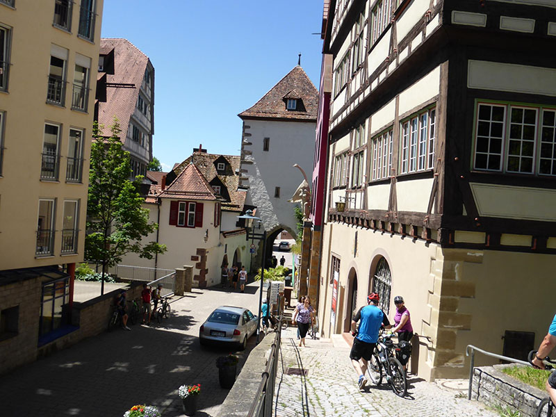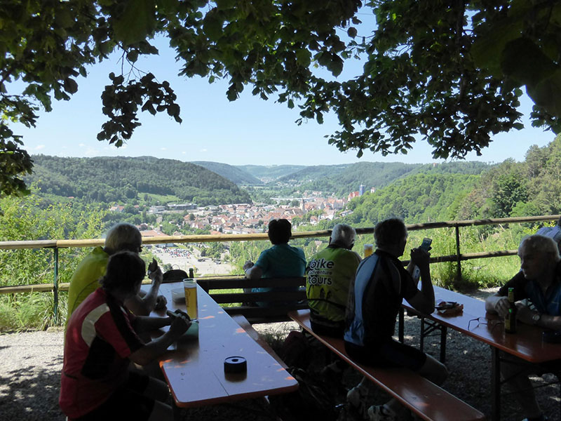 12 Radler fanden sich in Bondorf auf dem Startplatz ein. 6 davon mit Elektro-Unterstützung und 6 mit herkömmlichen Rad. Auf meist befestigten Wegen ging es größtenteils außerhalb des Waldes in der Sonne durch das Obere Gäu (Korngäu) durch abwechslungsreiche Natur-Landschaften. Als erstes Zwischenziel war der „Rauschbart“ bei allen willkommen. Diese Aussichtskanzel hoch über Horb gilt als der schönste Biergarten Deutschlands. Im kühlen Schatten mit sonniger Neckartal-Aussicht konnte das Vesper und Bier genossen werden. Durch die schöne Altstadt von Horb ging es über den Marktplatz runter ins Neckartal. Auf dem asphaltierten Neckartal-Radweg überwiegend im Schatten bei angenehmen Temperaturen rollte man das Neckartal hinaus. Erst unter der imposanten Neckartalbrücke der A81 hindurch, dann unter der Weitenburg nach Bad-Niedernau. Durch einem kurzen Abstecher das Katzenbachtal hinein konnte an der Römerquelle der dringend benötigte Wasservorrat wieder aufgefrischt werden. Bald wurden die ersten Weinberge des Neckartales passiert. Durch die Altstadt von Rottenburg führte die Tour durch das schöne Weggental wieder hinauf ins Obere Gäu. Ein Radler hatte sich in Remmingsheim verirrt. Bei diesen Temperaturen kam er an seinem Weg liegenden Brauereigaststätte nicht vorbei ohne seinen Durst zu stillen. Der Rest der Gruppe quälte sich mit letzten Reserven unter der senkenden Sonne vollends das Eisental hinauf nach Seebronn. Im Wurmfeld bei Bondorf konnten alle Radler im schattigen Biergarten die Wiedervereinigung feiern. Nach 66 km mit 650 Höhenmeter und 4:40 Stunden reine Radelzeit hatte jeder seinen Umtrunk verdient. Einige waren bereits mit dem Rad angereist und denen stand noch die Rad-Heimfahrt bevor. Ein Teilnehmer aus Calw hatte am Tagesende wohl um die 150 km auf seinem Tache und das bei den tropischen Temperaturen.