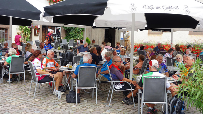 Aussichtsreich weiter ging die Tour über die Höhen zwischen Schopfloch, Oberiflingen und Dürenmettstetten. Nach einer rasanten Abfahrt hinunter durch Leinstetten ging es eben das Glattal hinaus durch Bettenhausen und Hopfau. Im Schloss-Cafe im Wasserschloss Glatt konnte man sich bei Kaffee und Kuchen ausgiebig stärken. Weiter rollte man wenig anstrengend den Neckartal-Radweg hinaus zurück nach Horb.