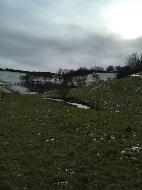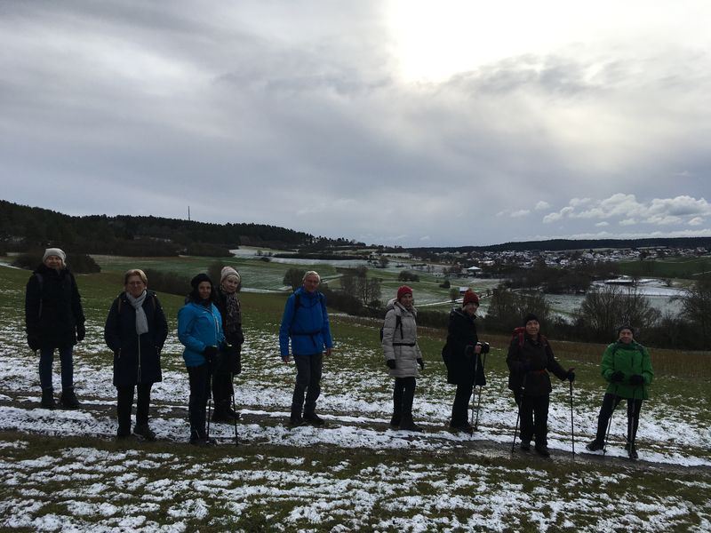 Die erste Wanderung im neuen Jahr führte über den Egenhauser Kapf hinunter ins Bömbachtal, von dort zur historischen Ölmühle, und dann einen steilen Wiesenhang hinauf zu den Sportplätzen im alten Neubaugebiet von Egenhausen. In großem Bogen über die Felder, mit Blick in Spielberger Gemarkung, landeten wir schließlich unten im ursprünglichen Dorf am alten Rathaus.