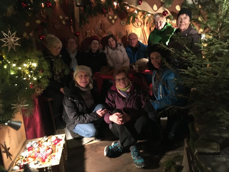 Vorher aber wurden wir noch mit heißem Punsch in der Märchenwelt von „Hänsel und Gretel“ empfangen. Die hatte Herr Sowinski im Raum des alten Rathauses liebevoll gestaltet, in einem dichten Gewirr von Tannen mit weihnachtlichen Lichterketten, und mit verschiedenen Szenen aus dem Märchen in lebensgroßen Figuren. Ein kuscheliger Ausklang der Wanderung.