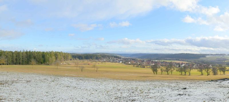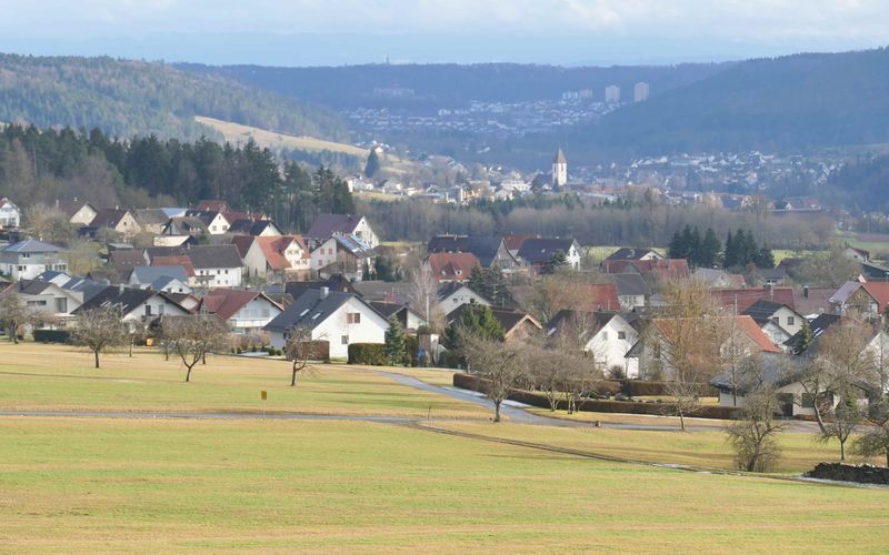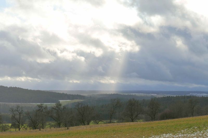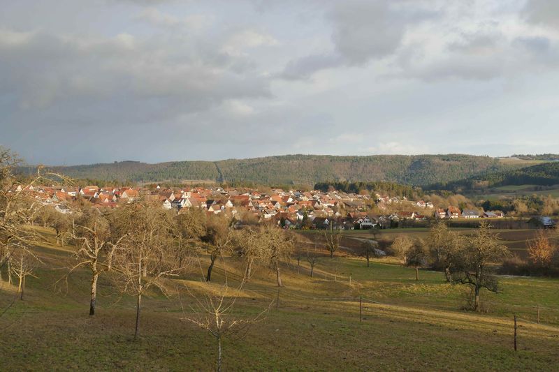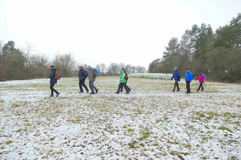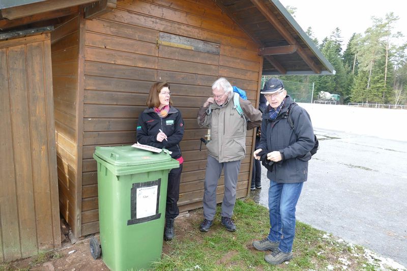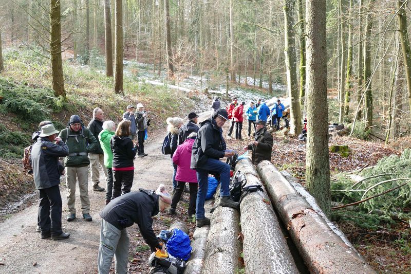 Bei der Ankunft am Sportheim Rotfelden verabschiedete sich die Sonne erst mal. Renate nahm die Essenswünsche windgeschützt unter dem Vordach des Geräteschuppens auf. Pünktlich um 12 gingen wir los, zunächst um den halben Sportplatz, dann durch den Wald. In großem Bogen erreichten wir Rotfelden, bestaunten das Denkmal der Saurierfundstelle Rotfelden, und stiegen am Ende des Ortes wieder auf in den Wald. Windgeschützt stärkten wir uns dort in der Mittagspause. Als wir nach steilem Anstieg den Wald verließen, empfing uns starker Wind mit Regen und Graupel. So erreichten wir -vorbei an Mindersbach- den „Augenblick Rotfelden“, leider ohne gute Aussicht. Schnell gingen wir wieder talwärts, dort ließ auch der Wind wieder nach. Nach einer längeren Waldpassage durquerten wir Ebershardt und gelangten zum dortigen Augenblick am Sportplatz. Dort hatten wir eine gute Sicht über Nagold bis zur Alb im Hintergrund. Von dort war`s noch eine knappe Stunde zu den Autos am Sportheim. Das gute Essen war die Krönung einer abwechslungsreichen Wanderung.