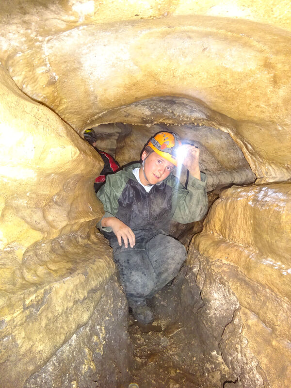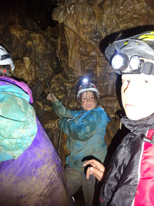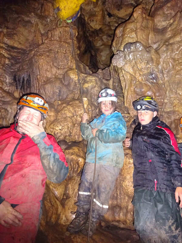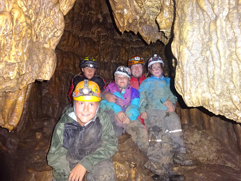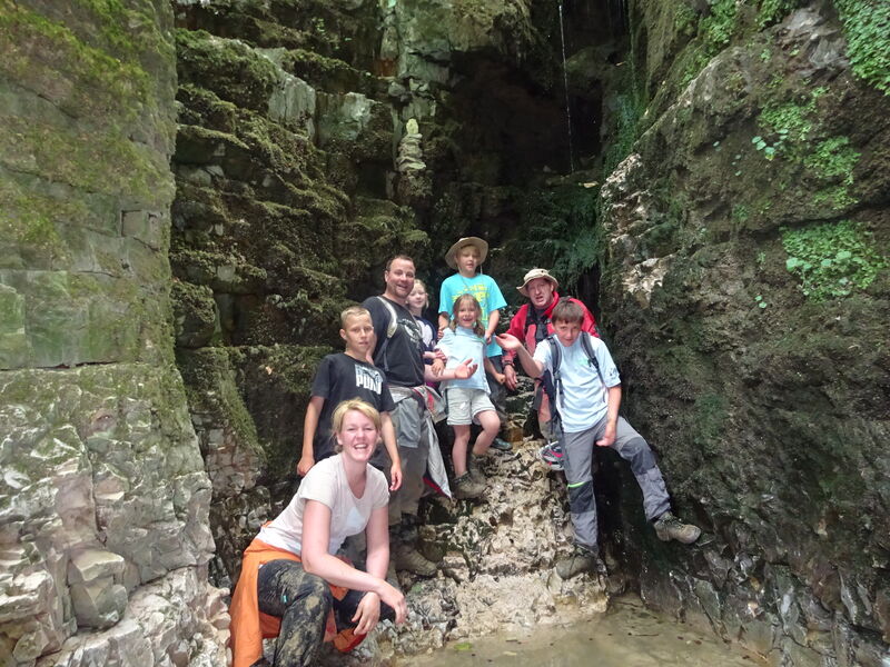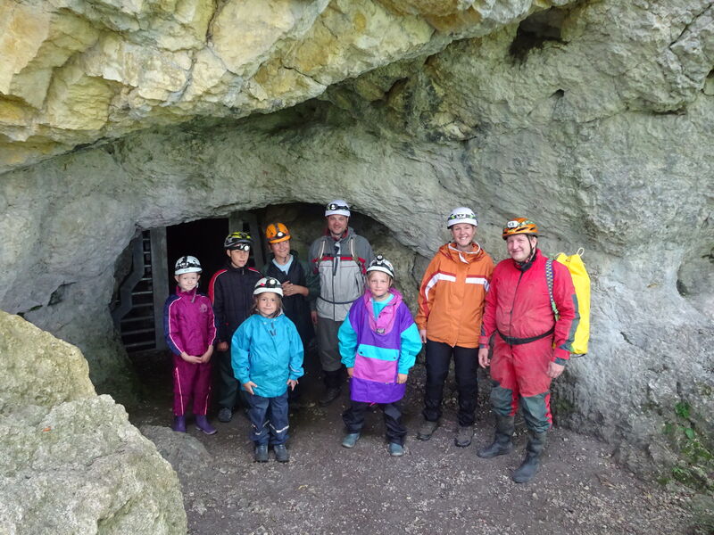 Dieser in die Tiefe folgend, wurde es dunkler und dunkler, bis nur noch unsere Stirnlampen glimmend die Wände schwach erhellten. Tief drunten endete unsere Reise in einem Sumpf von Erden und Lehm. Von dort verschloss sich ein Weiterkommen, obgleich an der Seite ein Gänglein nach oben führet. Auch dieses ward nach 8 Klafter verschlossen und ein Weiterkommen nur für Kleinwüchsige möglich. Da hieß es zurück über Stock und Stein mit Hilfe eines Strickes, das Tageslicht wieder zu erlangen. Nach Verzehr unseres 2. Frühstückes ging es zurück nach Urach und durchs Elsach Thale auf die Kadde Ebene. Westlich der Burg Hofen am Abbruch ins Thale zu Schlattstall, wusch sich die Gustav Jakob Höhle in den Fels. In deren Gänglein arbeiteten wir uns Elle um Elle tiefer in den Fels. Das Gänglein wurd mal schmäler mal breiter, mal niedriger mal höher und mal in geräumigen Hallen mit glitzernden Tropfsteinen geschmückt. Nach quälenden 200 Klafter, ward das Tageslicht am Ende des dunklen Ganges erreicht. Hinterher genossen wir Würste und Brote an der Feuerstelle am Fuße der Hukah Höhle. Unsere Automobile brachten uns heil zurück in unsere Heimat.