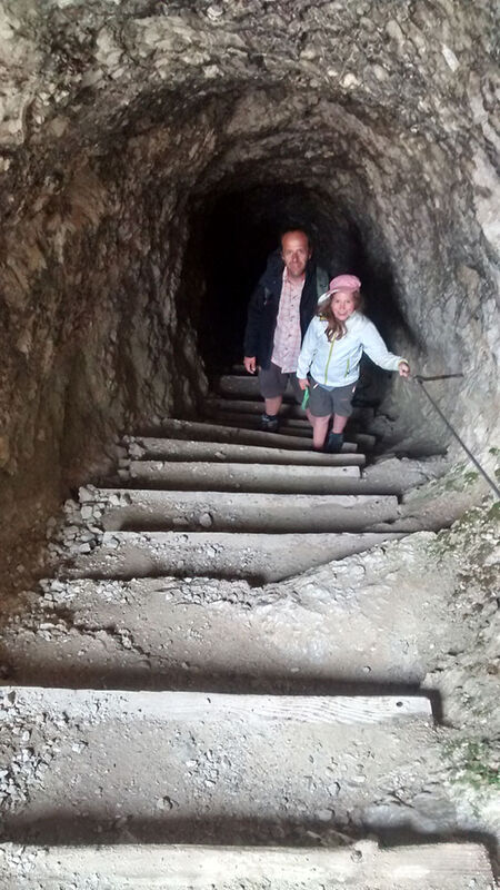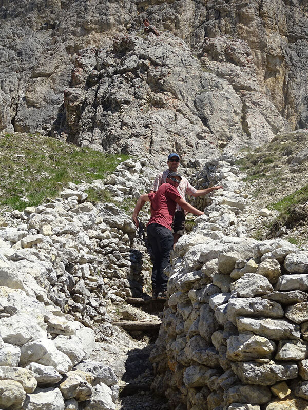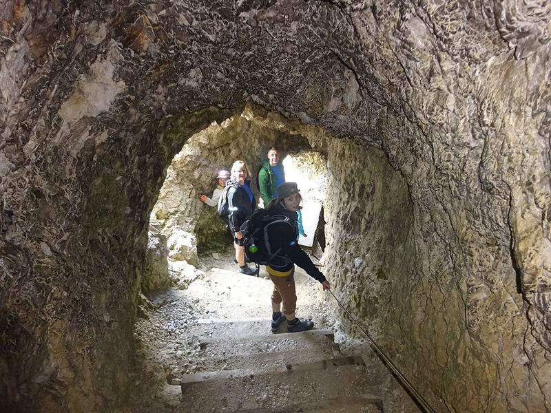 Am zweiten Tag haben wir uns den Falzaregopass-Kleiner Lagazuoi gegönnt. Dort war im 1. Weltkrieg Frontgebiet, und die Spuren sind auch heute noch unübersehbar. Aufgestiegen sind wir über den Kaiserjägersteig, mit einigen gesicherten Passagen, oben angekommen sind wir über den Gipfel und dann durch den Lagazuoi-Stollen, den die Alpini 1100m durch den Berg gegraben haben, wieder abgestiegen.
