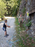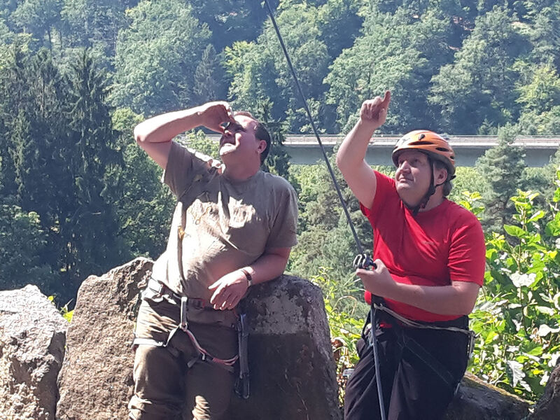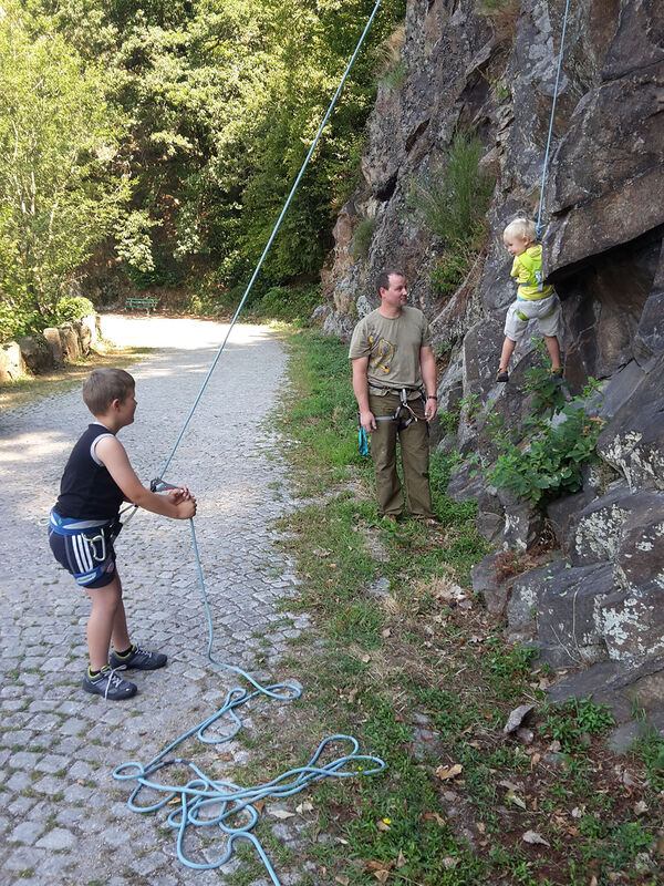 Wie Dienstags zuvor ausgemacht, traf sich die Familiengruppe am sonnigen Sonntagmorgen in Salzstetten, um die Murgtaler Felsen zu testen. Als erstes gings an die Gausbacher Strassenfelsen. Eine Route konnten wir gleich im Vorstieg meistern und ein Toprope einhängen, die andere ging blos bis zur ersten Zwischensicherung. Muss wohl noch etwas warten. Als am Nachmittag die Sonne reinbrannte, haben wir uns entschlossen, den Grafensprung zu suchen. Kurz vor Gernsbach wurden wir fündig. Der untere Teil liegt im Wald und war angenehm schattig. Da er nicht im Kletterführer beschrieben ist, ist er der Teil auch noch schön griffig. Also wieder los und Vorstieg in zwei Routen, Toprope einhängen und alle kamen kletternd auf ihren Kosten. Am Abend gings noch ins Eiscafe nach Baiersbronn. Zum Glück war ein Brunnen in der Nähe, in dem konnten sich die Kinder gleich noch waschen. Alles in Allem eine gelungene Schwarzwaldfahrt und vielen Dank an Michael für initiieren und organisieren.