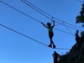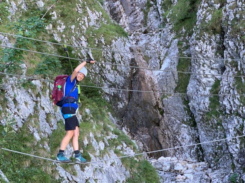 Zu Beginn des Steigs gibt es hier eine Drahtseilbrücke. Diese musste auch gleich ausprobiert werden. Nach diesem Highlight ging es gut gesichert in knapp zwei Stunden bis zum Tegelberghaus (1.707 m). Bei der Rast dort konnten wir die vielen Gleitschirmflieger beim Starten beobachten. Über den normalen Bergweg ging es zurück zum Parkplatz.