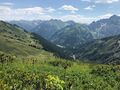 Am 3.Tag begann unsere Wanderung auf der Gipfelstation des Wallmendiger Horn. Von hier aus wanderten wir bei bestem Bergwetter über die Ochsenhofer Köpfe zum Grünhorn. Von hier aus hatten wir super Ausblicke über die ganzen umliegenden Gipfel, z.b Widderstein, Braunarlspitze, Hochkünzelspitze bis hin zur Roten Wand im Lechquellgebirge.