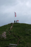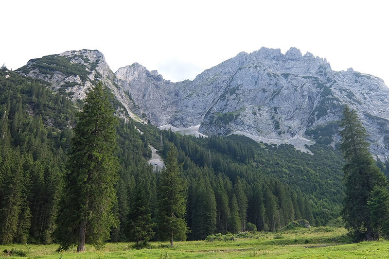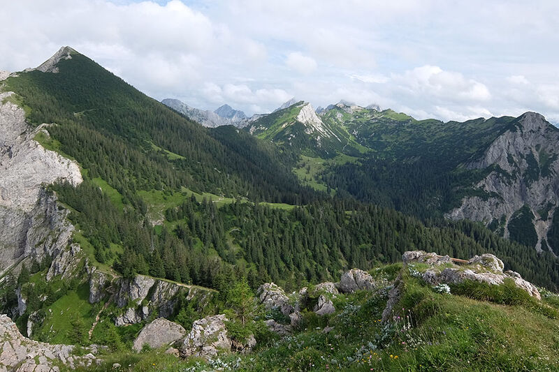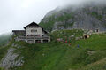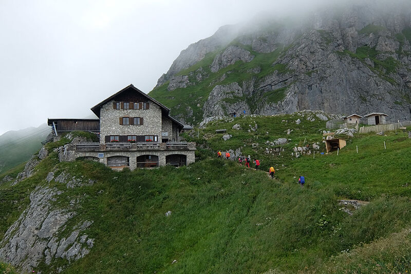 Leider hat es in der Nacht immer wieder geregnet und unsere Hoffnung auf einen weiteren Sonnentag verflog schnell. Ursprünglich wollten wir eine Tour auf die Große Schlicke (2.059 m) machen, aber beim Blick aus dem Fenster entschieden wir uns den Gipfel einfach auszulassen. Bei Nieselregen machten wir uns schließlich auf den Weg zur Bad Kissinger Hütte. Nach einer Mittagsrast am Füssener Jöchle wanderten wir auf dem Gräner Höhenweg weiter und kamen trocken auf der Hütte an. Zur Freude aller lag unser Schlaflager im neu angebauten Teil, jeder war von den großzügigen und schönen Zimmern begeistert und genoss noch eine heiße Dusche vor dem Abendessen.