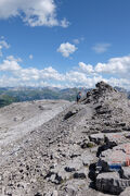 Auch am nächsten Tag hatten wir wieder bestens Bergwetter. Nach einem reichhaltigen Frühstück inkl. Rührei mit Speck, machten wir uns auf den Weg vorbei am Formarinsee über das Johannesjoch zur Göppinger Hütte. Bald war die Baumgrenze erreicht und wir wanderten auf einem alpinen Steig durch felsiges, teils verblocktes Gelände. Einige Passagen waren mit Stahlseil gesichert und erinnerten an einen Klettersteig. Die Altschneefelder boten eine willkommene Abkühlung vor dem letzten Anstieg, der uns auf 2.501 Meter brachte. Die Aussicht war bombastisch – die Sicht war so klar, dass sogar Drusenfluh, Sulzfluh und die drei Türme in der Ferne blitzten.