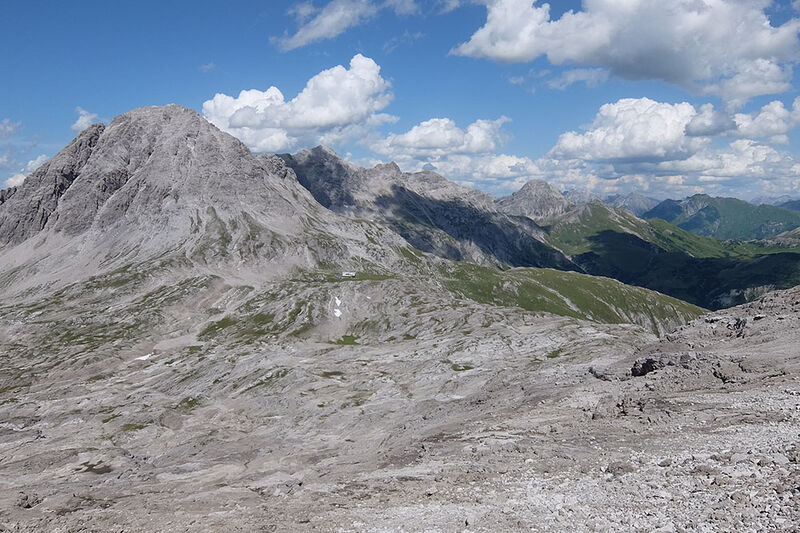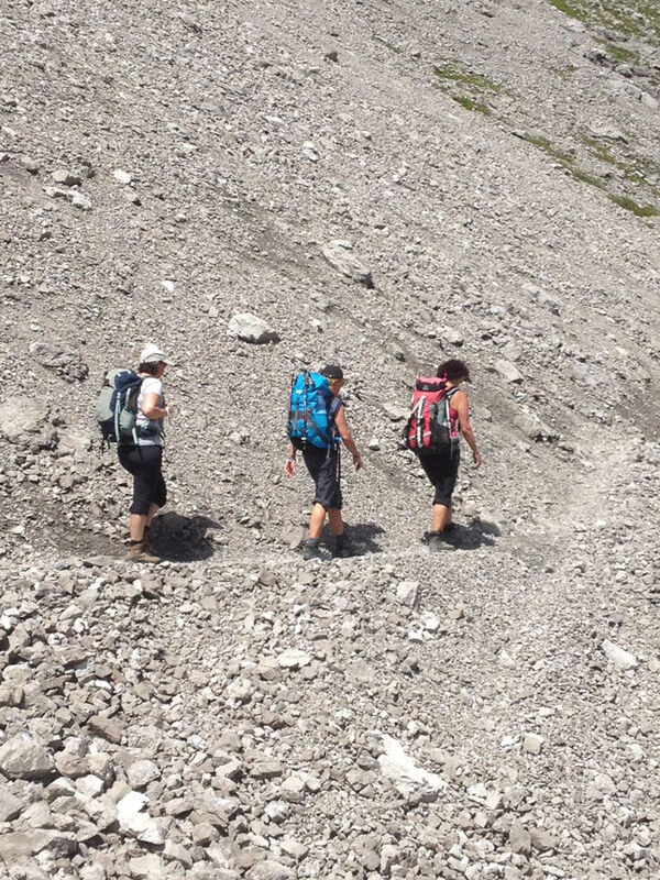 Der zweite Tag fing trotz strahlendem Sonnenschein etwas traurig an, Birgit, die am Vortag bei der Nässe ausgerutscht war, musste abbrechen und konnte nicht mit uns weiterwandern. Sie wurde von Ihrem Mann in Lech abgeholt. Nur noch zu 7. machten wir uns zu unserem 2. Etappenziel der Freiburger Hütte auf. In Gesprächen vertieft merkten wir an der ersten Alpe, dass wir falsch waren – wir hatten einen Abzweig verpasst. Was nun? Die Gruppe trennte sich. Gaby und Sarah fuhren mit dem Bus nach Lech, um neue Wanderschuhe zu kaufen. Gaby hatte Fußprobleme und ein blau angelaufener Zeh war die Folge. Die anderen legten einen Zacken zu, liefen zum zurück Spullersee und nahmen den Abzweig zum E4, über das Steinerne Meer zur Freiburger Hütte. Kurz vor dem Steinernen Meer fanden alle wieder zusammen, Gaby nun mit neuen Wanderschuhen und liefen gemeinschaftlich in der Hütte ein.