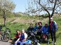 Über Öschelbronn und Nebringen ging es rasant hinunter ins Ammertal und vorbei an Gülstein. In den blühenden Baumfeldern vor der A81 musste die erste Zwangspause eingelegt werden wegen einem platten Reifen. Bei der steilen Auffahrt durch Mönchberg mussten einige ihr Rad schieben. Entschädigt wurde diese Anstrengung durch die schöne Aussicht von dem Halbhöhen-Panoramaweg über Kay. Durch die blühenden Baumfelder und durch Breitenholz ging es nach Entringen. In der Ortsmitte wurde beim Back-Cafe Gehr im Freien eine sonnige Vesperpause eingelegt. Der „Plattfuß-Radler“ hatte dabei Gelegenheit hier seinen (schwachen) Reifen-Mantel zu wechseln.
