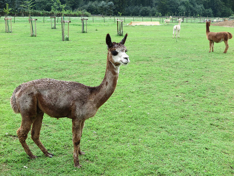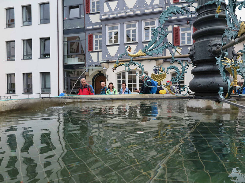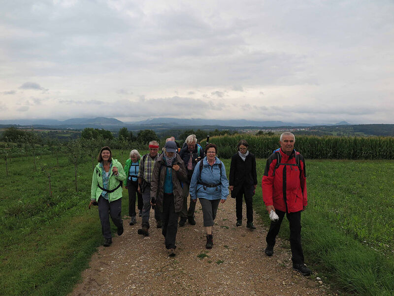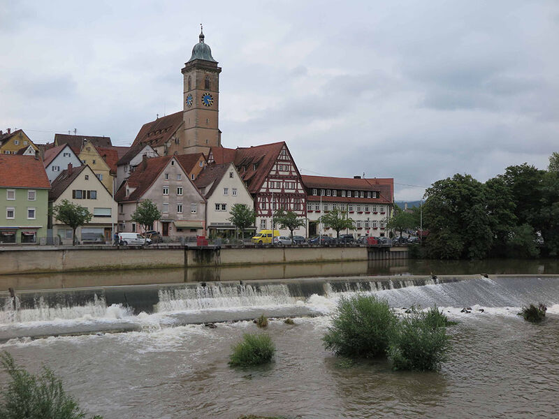 Als Juliwanderung war die neunte Neckarweg-Etappe von Mittelstadt nach Nürtingen angesagt. Metropol-Ticket, also konnte man schon ab Nagold mit dem Bus nach Herrenberg fahren. Von dort mit der Bahn nach Reutlingen, 4 Minuten Umsteigezeit und mit dem Bus weiter nach Mittelstadt. Die Bahn hatte drei Minuten Verspätung, doch der Bus musste an der Ampel warten, und so konnten wir uns durch Armwinken bemerkbar machen und er wartete auf uns. Immerhin waren wir ja auch als Gruppe angemeldet. In Mittelstadt mussten wir mit Schirm starten, selbst am Trockenhang-Biotop ließ der Regen nicht nach. In Neckartenzlingen stellten wir uns in der Bushaltestelle an der neuen Radbrücke unter, aber da war der Regen schon fast vorüber. Der Weiterweg führte über die Erms-Mündung entlang des Hochwasserführenden Neckar zur Mittagspause auf der Terasse Seerestaurants am Aileswasensee. Dort konnten wir die Schirme endgültig einpacken. In Neckartailfingen verließen wir den ausgeschilderten Weg, überquerten den Neckar, besichtigten die 900 Jahre alte Martinskirche mit dem schiefen Turm und gelangten vorbei an üppig tragenden Brombeerhecken auf den Heerweg. Ein schöner Blick übers Neckartal auf die Alb mit Jusi und Burg Neuffen belohnte für den Aufstieg. Bei einem Abstecher zur Alpakafarm oberhalb Neckarhausen wurden wir Zeuge eines lang andauernden Streites zweier Tiere, außerdem wurde gerade ein Junges geboren und auf dem Arm des Züchters fortgetragen. An einem Erdbeerfeld vorbei kamen wir wieder auf den Neckarweg und folgten der Markierung nach Nürtingen. Kurzer Gang durch die Altstadt, und dann Schlusseinkehr im interessanten Schlachthofbräu in einem ehemaligen Schlachthof. Frisch gestärkt gelangten wir in 15 min zum Bahnhof und hatten eine problemlose Heimfahrt.