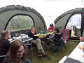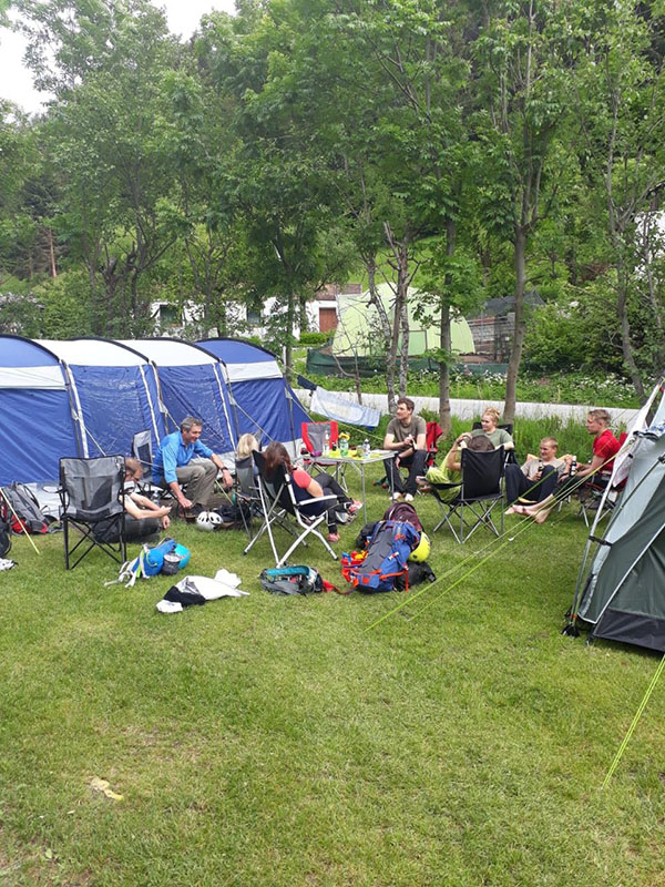 Am Campingplatz angekommen, trafen wir uns mit den anderen Teilnehmern und richteten in Windeseile unser Lager ein, um schnell an die Felsen zu kommen. Etwa die Hälfte von uns verteilte sich an den Sportkletterfelsen, während die andere Hälfte sich ans Plaisierklettern in Tieftal machte. Leider war uns das Wetter am ersten Tag nicht sehr zugetan und wir wurden nach kurzer Zeit vom Fels geregnet. Nach einer mehr als ausgedehnten Mittagspause war noch eine kurze Klettereinheit möglich, bevor wir uns ans grillen machten. Gut gelaunt verbrachten wir unseren Abend am Lagerfeuer und flüchteten ab und zu vor dem Wetter in den Gemeinschaftspavillon.