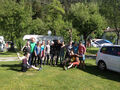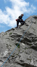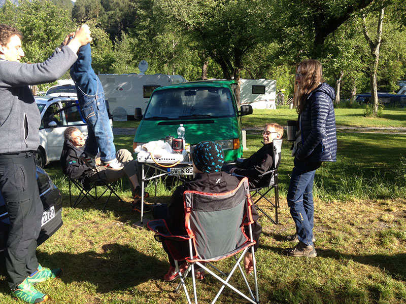 Am Montag starteten wir mit einem schnellen Frühstück und machten uns dann ans klettern, um pünktlich zum Mittagessen und zum Abbau des Lagers wieder zurück zu sein. Auch heute war das Wetter wieder herrlich und der Fels war etwas leerer als am Vortag. Trotz der guten Bedingungen versuchten wir pünktlich wieder am Campingplatz zu sein. Während der Eintopf vom Vortag aufwärmte, bauten wir die Zelte und den Pavillon ab und verfrachteten alles zurück in die Autos. Danach setzten wir uns noch mal zusammen um gemütlich zu essen. Als Nachtisch genehmigten wir uns noch ein Eis vom Campingplatz-Kiosk und hängten eine Weile die Füße in den kalten Pool, bis unser Häuptling Patrick uns zur Rückfahrt antrieb.