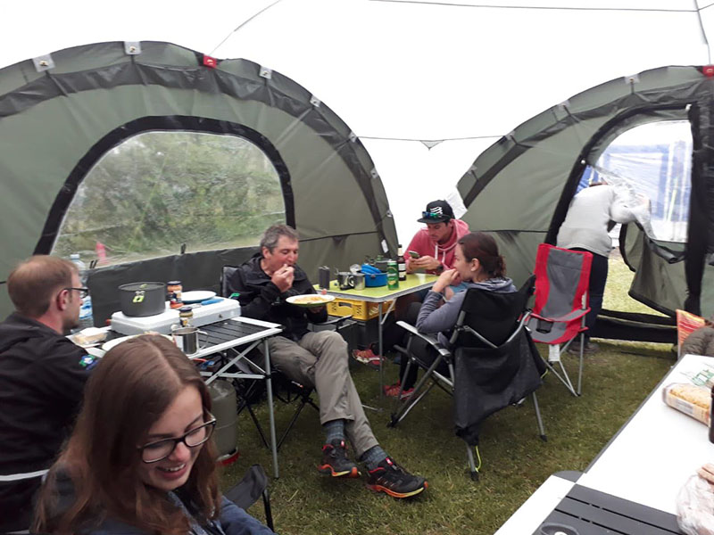 Der nächste Tag begann mit strahlendem Sonnenschein. Nach einem ausgedehnten Frühstück verteilten wir uns wieder an die Felsen und dieses Mal machte uns das Wetter keinen Strich durch die Rechnung. Wir kletterten den ganzen Tag und genossen die gut abgesicherten Routen in vollen Zügen. Gegen Nachmittag lockte uns dann Kaffee und Kuchen zurück ins Lager, wo wir uns fröhlich schnatternd von unserem Tag berichteten und plötzlich war es auch schon wieder Zeit, sich ans Abendessen zu machen. Nach dem Abendessen kamen wir alle im Pavillon zusammen und ließen den Abend bei Gesellschaftsspielen gemütlich ausklingen.