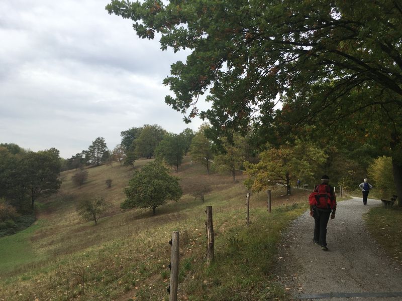 Nach einer kleinen Vesperpause, für die wir die Eingangshalle des jetzt zur Universität gehörigen Schlosses zweckentfremdeten, um uns vor der noch ungewohnten Kälte zu schützen, führte Reinhold Geigle uns auf einer kleinen, ca. 7 km langen Wanderung durch das Naturschutzgebiet Eichenhain. Uns Schwarzwald gewohnten Nagoldern ist weitgehend nicht bewusst, welch schöne Landschaftswanderungen es auch direkt um Stuttgart gibt. In diesem Fall ging es um ein Gebiet von Trockenwiesen mit durchaus steilen Hügeln und einem wunderbaren Bestand alter, meist einzeln stehender Eichen.