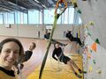 Die muntere Gruppe an Teilnehmern tauchte mit fortschreitendem Kurs immer tiefer in die Welt des Hallenkletterns ein. Themen vom eigenen Material, Einbinden, Sichern, Kletterkomandos und Hallenregeln folgten Schlag auf Schlag. Fragen nach „wie komme ich mit diesen Griffen da hoch ohne danach Muskelkater zu haben“ mussten ausführlich ausprobiert werden, ebenso wie das Gefühl zu Fallen und Fangen. Auch ein klein wenig Technik musste ausprobiert werden. Schließlich ist der wichtigste Muskel beim Klettern bekanntlich der Kopf.