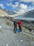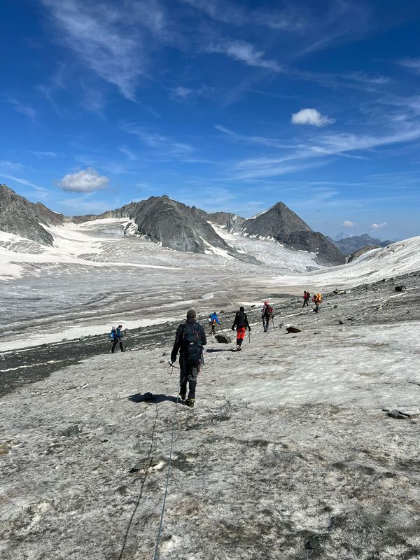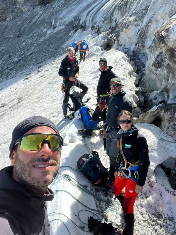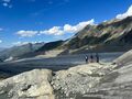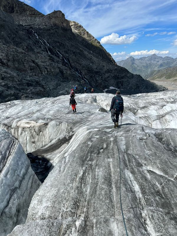 Der erste Übergang zum Eis geht überraschend gut, aber kurz darauf wird es spannend. Der Gletscher wird immer steiler bis ein Weitergehen nicht mehr möglich ist. Zudem lauern unten steiles Felsgelände und eine offene Randkluft, also abseilen! Nachdem ich alle abgelassen habe, muss ich selbst auch noch runter, daher steckt meine Eisschraube immer noch (und wohl für alle Zeiten) dort oben. Danach gehts über den „Glacier de Corbassiere“ flott voran, immer unterhalb des gewaltigen Massivs des Grand Combin. Nachdem die Steilstufe unerwartet gut zu überwinden war zeigt der Gletscher im unteren Teil seine Zähne. Und doch finden wir eine Rampe, die uns recht sicher durch dieses Spaltenlabyrinth leitet. Bis kurz vor dem flachen, unteren Gletscherteil, wo der Gletscher nochmal extrem steil abbricht. So steckt also eine zweite Eisschraube für immer im Glacier. Die letzte Tücke des Tages ist es, den Übergang zum Felsgelände zu finden, offenbar hat man versäumt, die Markierungen der Gletscherschmelze entsprechend nach unten zu erweitern. Doch auch das schaffen wir und so treffen wir um 18:30 Uhr erschöpft aber glücklich an der „Cabane FXB Panossiere“ ein, 14 Stunden nach dem Aufbruch! Isabell hatte recht uns so früh fort zu schicken. Unsere Begeisterung für sie wird noch größer als wir erfahren, dass sie angerufen hat um sich zu erkundigen, ob wir gut auf der zweiten Hütte angekommen sind.