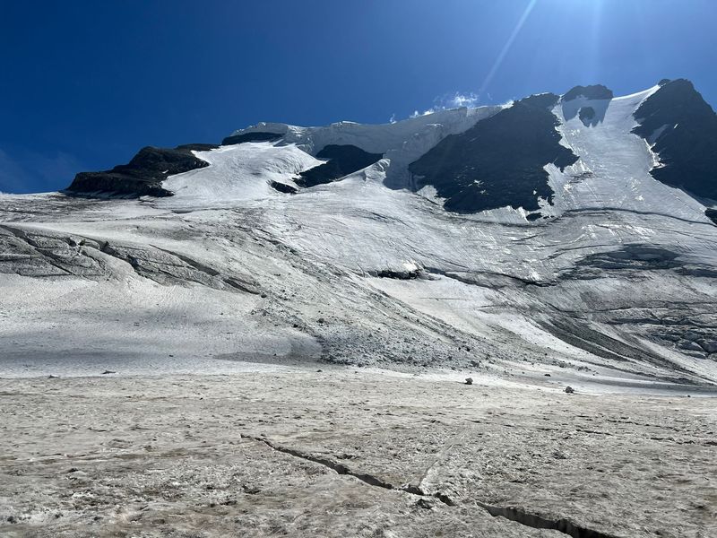 So sind wir dann in finsterer Nacht um 4:30 Uhr unterwegs Richtung „Col du Metein“, unser höchster Punkt auf 3609m. Die Orientierung ist zunächst durch viele Steinmänner recht einfach, das ändert sich kurz unterhalb des Jochs. Hier gibt es weder Wegspuren noch Markierungen, offensichtlich ist ein Stück des Wegs weggebrochen. Zum Glück ist es inzwischen hell und wir können uns erfolgreich durch diese Geröllwüste kämpfen.