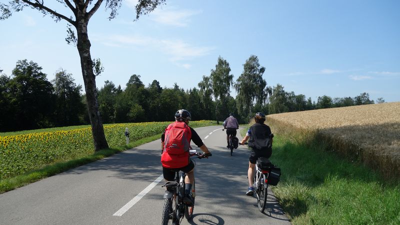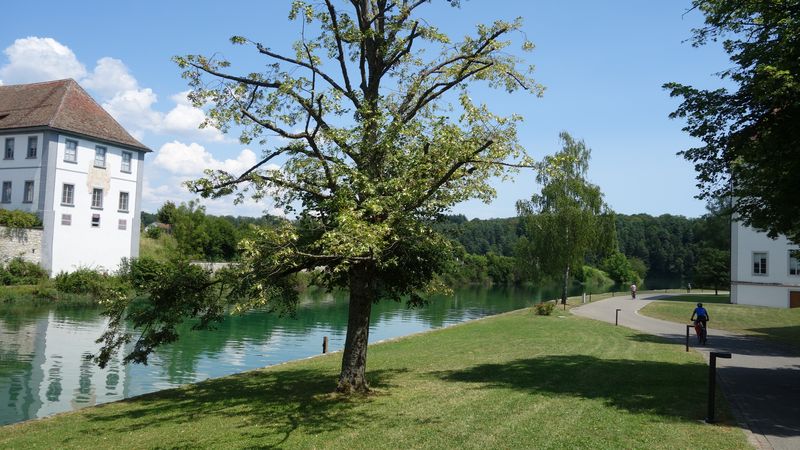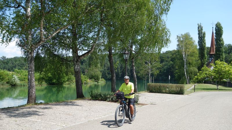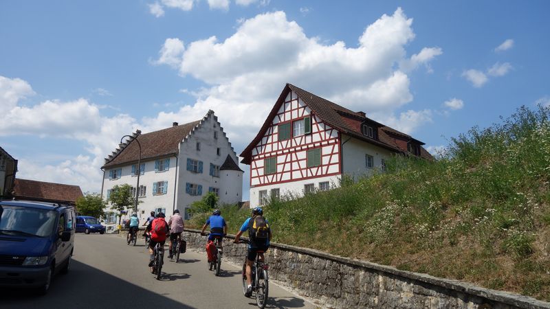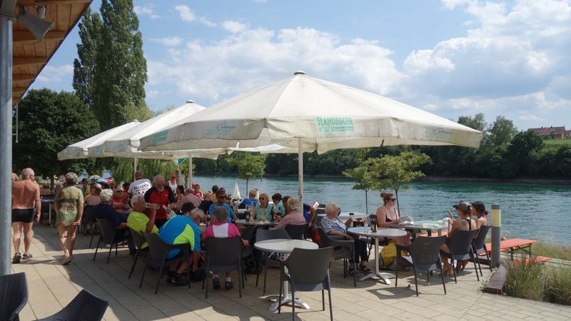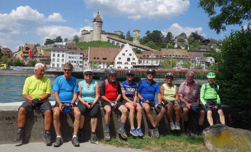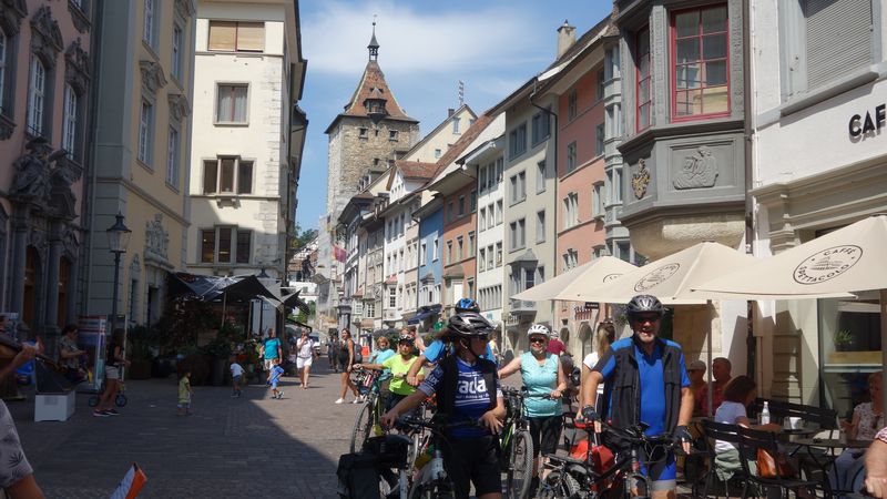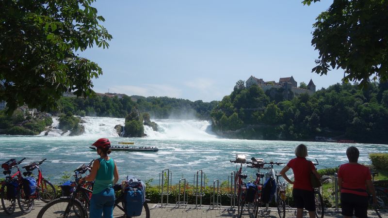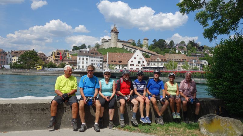 16 Teilnehmer des Alpenvereins Calw und Nagold führte der Tourenleiter Roland Kling am 18.7.2019 durch das Hegau und Schaffhauserland. Von Hilzingen unter dem Hohentwiel ging es über die (grüne) Grenze in die Schweiz nach Thayngen und Schaffhausen. Durch die schöne historische Altstadt von Schaffhausen wurden die Räder geschoben. Eine Vesperpause gab es an dem beeindruckenden Rheinfall, dem ersten Highlight der Tour. Nach Jestetten (D)wurde wieder die Grenze und der Rhein über die schöne, mehrere hundert Jahre alte Holzbrücke auf die Halbinsel Rheinau überquert. Ein weiteres Highlight war das ehemalige Kloster auf der dortigen Rheininsel. Rheinaufwärts ging es immer dem Rhein entlang an Schaffhausen vorbei durch die Deutsche Enklave Büsingen nach Gailingen am Hochrhein. Hier wurde in dem Rheinstrandbad eine längere Mittags- und Badepause eingelegt. Bei 22°C Wassertemperatur eine herrliche Erfrischung. Zudem ist es immer wieder ein besonderes Erlebnis sich beim Baden von der enormen Wasserkraft des Rheines Flussabwärts treiben zu lassen. Mit dem Rad war dann über Ramsen und Gottmardingen nach 70 km bald wieder der Ausgangsort Hilzingen erreicht.