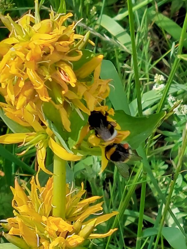 Und neben dem Weg entdeckten wir üppig blühendes Knabenkraut und gelben Enzian, in den sich Hummeln tummelten. Auch das Wetter machte optimal mit: Sonne, mit ein paar Wolken gerade als wir über eine weite Wiesenfläche wanderten.
