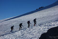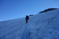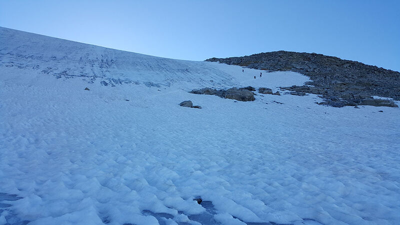 Vom Abendessen und Frühstück gestärkt konnte die Gruppe zu gemütlicher und angenehmer „späten Stunde“ um 6 Uhr Morgens den Gipfelaufstieg antreten. Für Hochtouren eine sehr späte Zeit aber eine, wie sich zeigte, in diesem Falle durchaus gute Startzeit. Über Moränen-Schutthalden und abgeschliffene Granitrücken ging es die ersten 400 Hm Richtung Anseilplatz. Ab hier verblieben noch 800 Hm zu bewältigen. Wie am Vorabend besprochen wurde angeseilt und es ging mit Steigeisen an den Füßen weiter. Bis zu 35 Grad steile, vereiste und verfirnte Passagen führten uns nach insgesamt ca. 6 Stunden auf den felsigen Gipfelaufbau des Gran Paradiso. Die größten Menschenmassen waren schon wesentlich früher da. So konnten wir den Gipfel mit weniger (nicht mit wenig) gemeinsamen Gästen geniessen.
