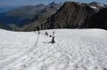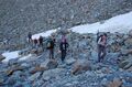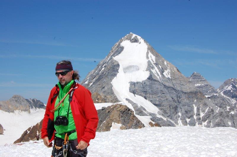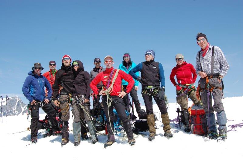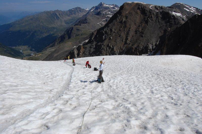 Am ersten Tag ging einiges, den eigentlich mit 2 bis 2,5 Stunden angegebenen Weg zur Schaubachhütte schafften wir in eindreiviertel Stunden, oben wurden wir dann entsprechend kulinarisch verwöhnt. Auch der zweite Tag war erfolgreich, über den Suldenferner ging es zur Suldenspitze, mit 3376m unser erster Gipfel. Meine Seilschafts-Einteilung (hinter mir gehen Alexandra, Thomas, Andrea und Günther, hinter Chichi ist die Reihenfolge Susanne, Markus, Stefan, Tommy) wird nicht hinterfragt. Offensichtlich hat niemand Lust auf einen erneuten Vortrag über die Funktionen in einer Gletscher-Seilschaft. So belasse ich es dabei, meine Seilzweite über ihre besondere Verantwortung für meine Gesundheit aufzuklären.
