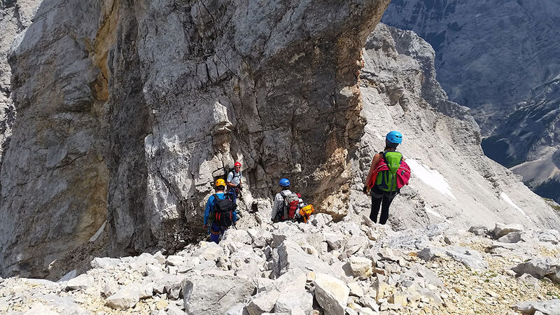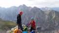 Kurz nach 7 ging´s los, zuerst über den Brunntalgrat-Klettersteig hoch zum Jubiläumsgrat, auf diesem über mittlere und äußere Höllentalspitze sowie Vollkarspitze in die Grieskarscharte und runter durch das Matheisenkar zur Höllentalangerhütte, die wir kurz nach 7 ereichten, ziemlich geschafft aber überglücklich. Eine fantastische Tour mit Klettersteig- aber auch vielen Freikletter-stellen, großartigen Tief- und Weitblicken, Balanciereinlagen 1000m über´m Tal und das ganze bei bestem Kaiserwetter. Nachdem die Tour im Vorjahr ins Wasser gefallen war, war es im zweiten Anlauf umso schöner.