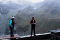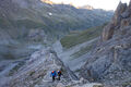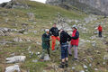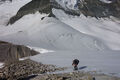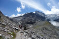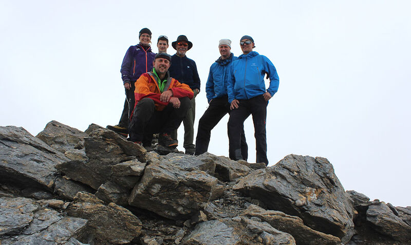 Der nächste Morgen begrüßte uns feuchtfröhlich mit Bindfäden die vom Himmel fielen. Geplant hatten wir für diesen Tag die Besteigung des Bishorn. Unter diesen Wetterbedingungen war an diese große Bergfahrt aber nicht zu denken. So nahmen wir um 5 Uhr das erste und um 7 Uhr das zweite Frühstück, um uns dann schnell wieder in unsere Betten zu legen. Das war zwar nicht das was wir uns vorgestellt hatten, aber eine bequeme Alternative für diesen Regentag. Um kurz vor 10 Uhr hörte der Regen auf und die Frage war was wir mit dem angebrochenen Tag anfangen sollten. Den ganzen Tag auf der Hütte rum zu sitzen kam bei einem Bierpreis von 6 Euro je Bier nicht in Frage! Ein kurzer Blick auf das vorhandene Kartenmaterial lies schnell ein lohnendes Ziel erkennen. Das Barrhorn ist einer der höchsten Wandergipfel der Alpen. Womit wir wenigstens ein Superlativ abhaken konnten. Der Tatendrang innerhalb der Gruppe war groß. So verwunderte es nicht, dass nur wenige Minuten nach Ausrufen des neuen Ziels alle abmarschbereit vor der Hütte standen. Der Weg führte uns abermals durch das bereits bekannte Gässi und weiter über Schutthalden und Felsrippen. Die umliegende Bergwelt blieb meist in Wolken und Nebel gehüllt. Das erste Ziel, das Schöllijoch war nach wenigen Stunden bergauf Wandern erreicht. Hier beeindruckte der Steig der von der Topali-Hütte herauf führt. Wir sahen zwar nur die letzten Ausstiegsmeter, konnten uns aber aufgrund der Steile der Felsstufe gut vorstellen wie steil und ausgesetzt der Steig in der Wandmitte sein musste. Die am Schölli-Joch deponierten Rettungsgeräte der Bergwacht lassen auf häufige Einsätze der Retter schliessen. Von hier aus waren es nur noch wenige hundert Höhenmeter zum Gipfel des Barrhorn. Die zwar steil aber unspektakulär verliefen. Die Aussicht vom Vortag wurde uns leider aufgrund des schlechten Wetters nicht mehr gewährt. Wir hielten eine kurze Gipfelrast und machten uns dann im beginnenden Regen auf den Heimweg zur Hütte. Der Regen sollte den restlichen Tag unser Begleiter werden. So kamen wir 2,5 h später bis auf die Knochen durchnässt auf der Hütte an. Dennoch waren wir froh noch etwas aus dem Tag gemacht zu haben. Und immerhin sind wir die letzte Stunde nass geworden, das ist angenehmer als die erste Stunde des Tages nass zu werden. Wir entledigten uns der nassen Klamotten und waren gerade noch rechtzeitig zum Abendessen fertig.