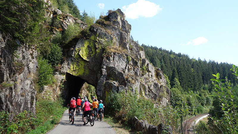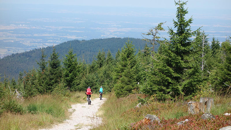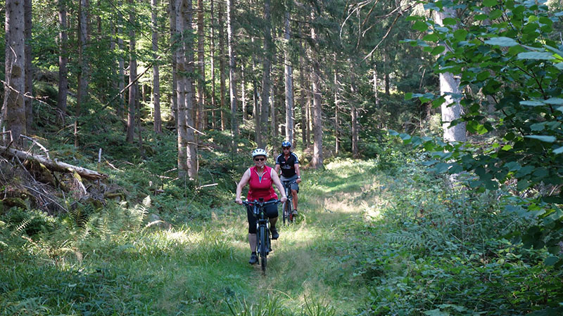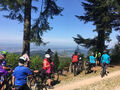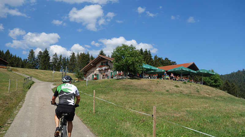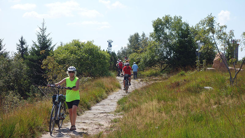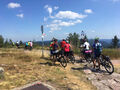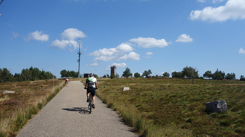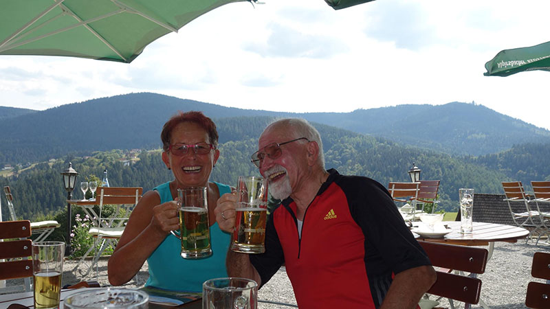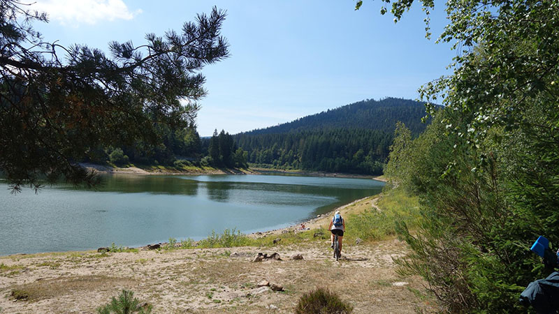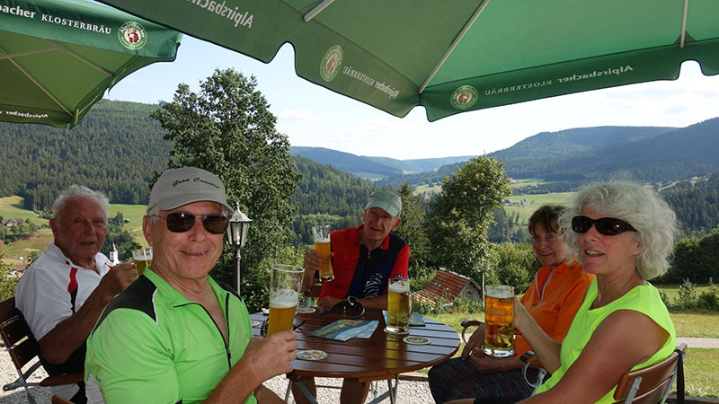 Eine Wettervorhersage für den 16.8.2018 mit über 30°C. Was lag da näher als der kühle Schwarzwald. Mit 16 Starter -fast alle mit Elektro-Unterstützung- trafen sich in Schwarzenberg im Murgtal. Das Schönmünz- und Langenbachtal ging es über Hinterlangenbach stetig aber mäßig steil hinauf zum Seibelseckle an der Schwarzwaldhochstrasse. Nach dem Touristenrummel am Mummelsee war bald der höchste Punk des Nordschwarzwaldes, die Aussichtsreiche Gipfel-Hochfläche der Hornisgrinde auf 1.164 m erreicht. Auf dem holprigen Westweg zweifelte so mancher Teilnehmer an der Rourenführung. Beim Vesper an der Skihütte Ochsenstall fehlten dann auch prompt 5 Teilnehmer. Sie waren einfach zu schnell und sind der Hauptgruppe vorausgeeilt. Deshalb blieb ihnen der Einkehrgenuss am Ochsenstall verwehrt. Die „Abtrünnigen“ konnten dann am Weiterweg in Untertmatt wieder eingesammelt werden. Auf dem Mannheimer-Weg ging es weiter hinüber nach Hundseck und Sand mit teils schönen Aaussichten ins Bühlertal und Rheintal. Bequem rollte man über Herrenwies hinunter zur Schwarzenbachtalsperre. Trotz niedrigem Wasserstand in diesem trockenen Jahrhundertsommer konnte man ein erfrischendes Bad nehmen. Eine kleine Singletrail-Einlage gab es auf dem alten Fußweg des Schwarzwasserbaches entlang hinunter nach Raumünzach. Auf dem Murgtal-Radweg war bald wieder der Startpunkt in Schwarzenberg erreicht. Von hier ging es nochmal knackige 150 Höhenmeter hinauf in die schöne Panoramahütte mit zünftiger Einkehr in deren Aussichtsterrasse. Nach 3 ½ Stunden Radelzeit mit 54 km und 900 Höhenmeter hatten alle Teilnehmer ein erfrischendes „Radler“ verdient.
