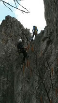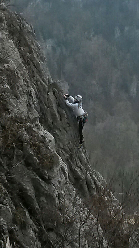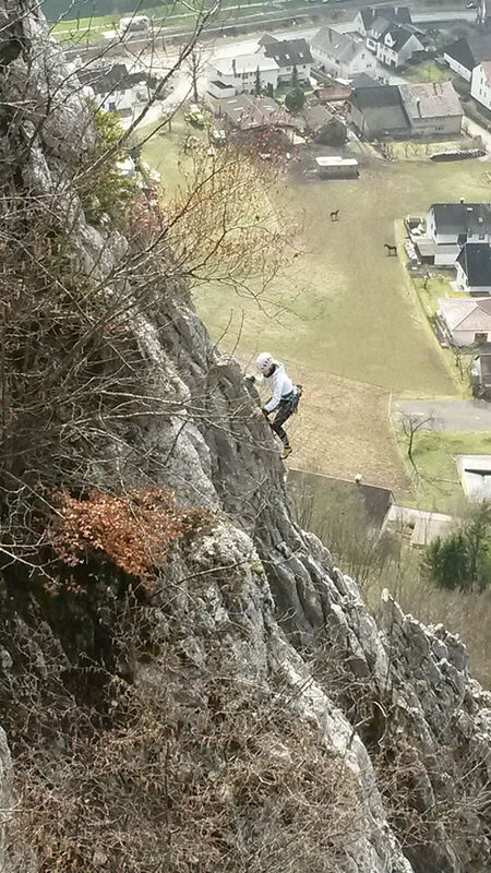 Der kommende Morgen begann mit einem reichhaltigen Frühstück und wurde direkt mit den ersten Kletterrouten an dem direkt neben dem Haus liegenden Stuhlfels fortgeführt. Einige stiegen direkt in die ersten Mehrseillängen ein, andere übten noch Vorstiegssichern und Standplatzbau in der Einseillänge – jeder konnte an diesem Vormittag die ersten Erfolge für diese Saison feiern. Da alle nach den ersten Berührungen mit dem Fels nicht genug bekommen konnten, wurden die Kletteraktivitäten in die in der Nachmittagssonne liegende Hausener Wand verlegt, die auf der anderen Talseite liegt. Neben erfolgreichen Routenbegehungen wurde auch intensiv die Sonne genossen.
